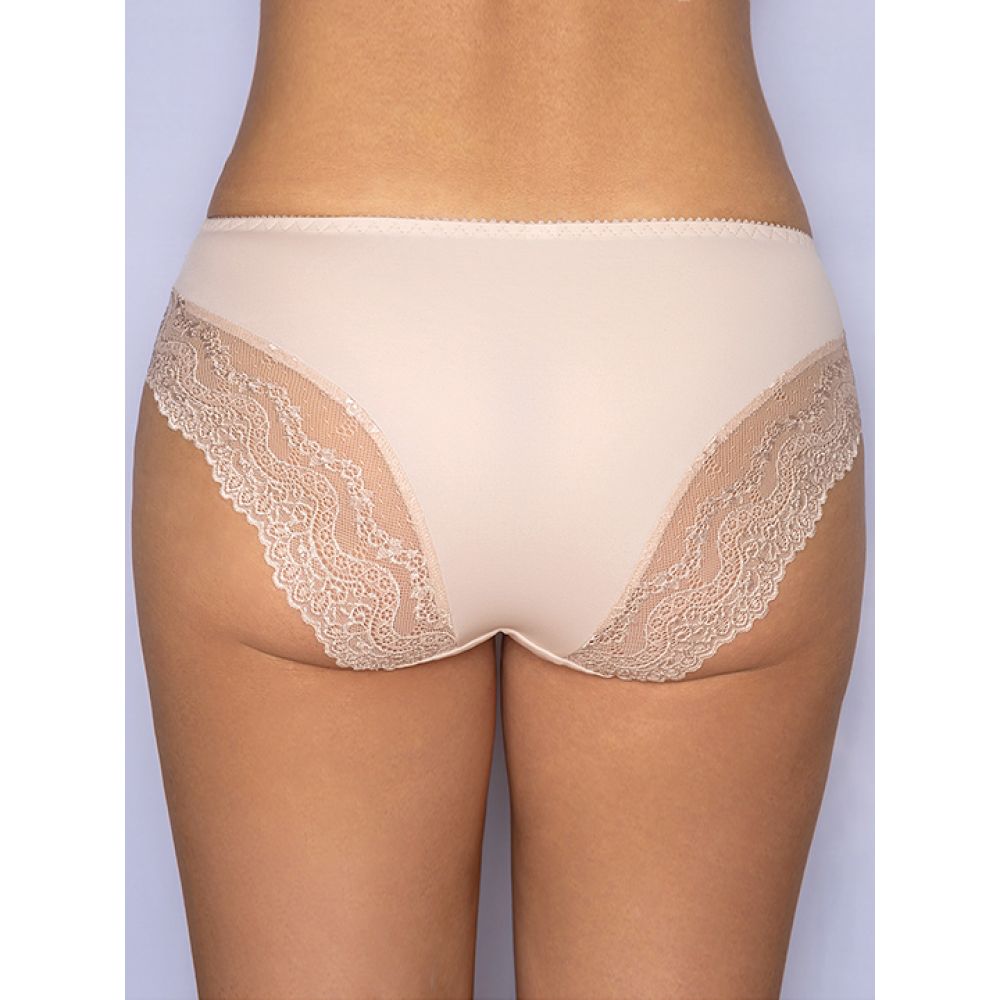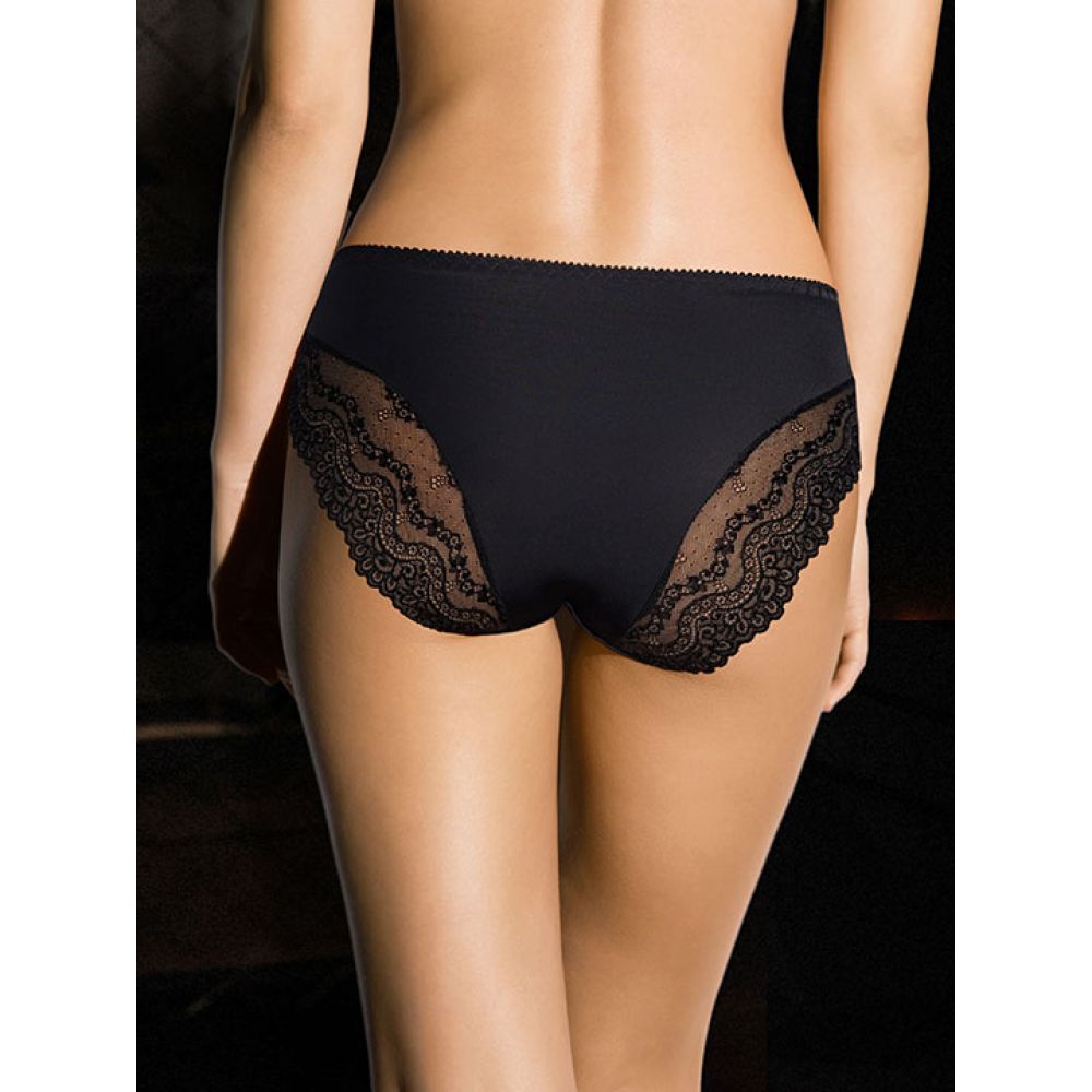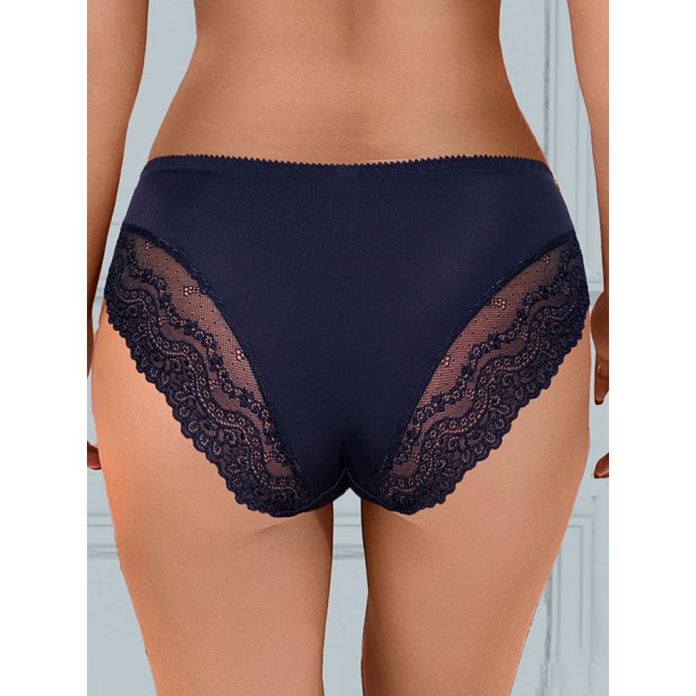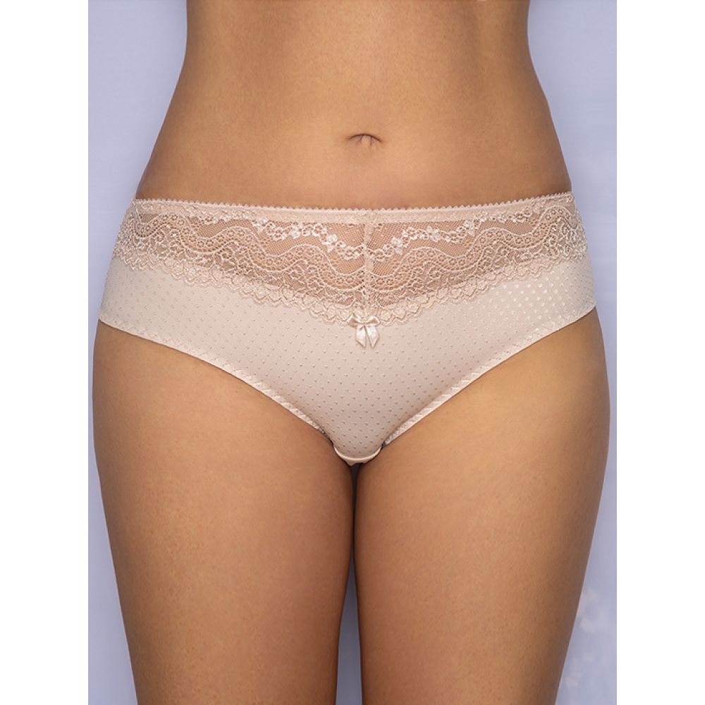 Трусы-слип 211 со средней линией талии. Выполнены из набивной микрофибры в точку, гладкой микрофибры и эластичного кружева. Срезы по краю ножек обработаны на плоскошовной машине. Украшение: атласный бантик.