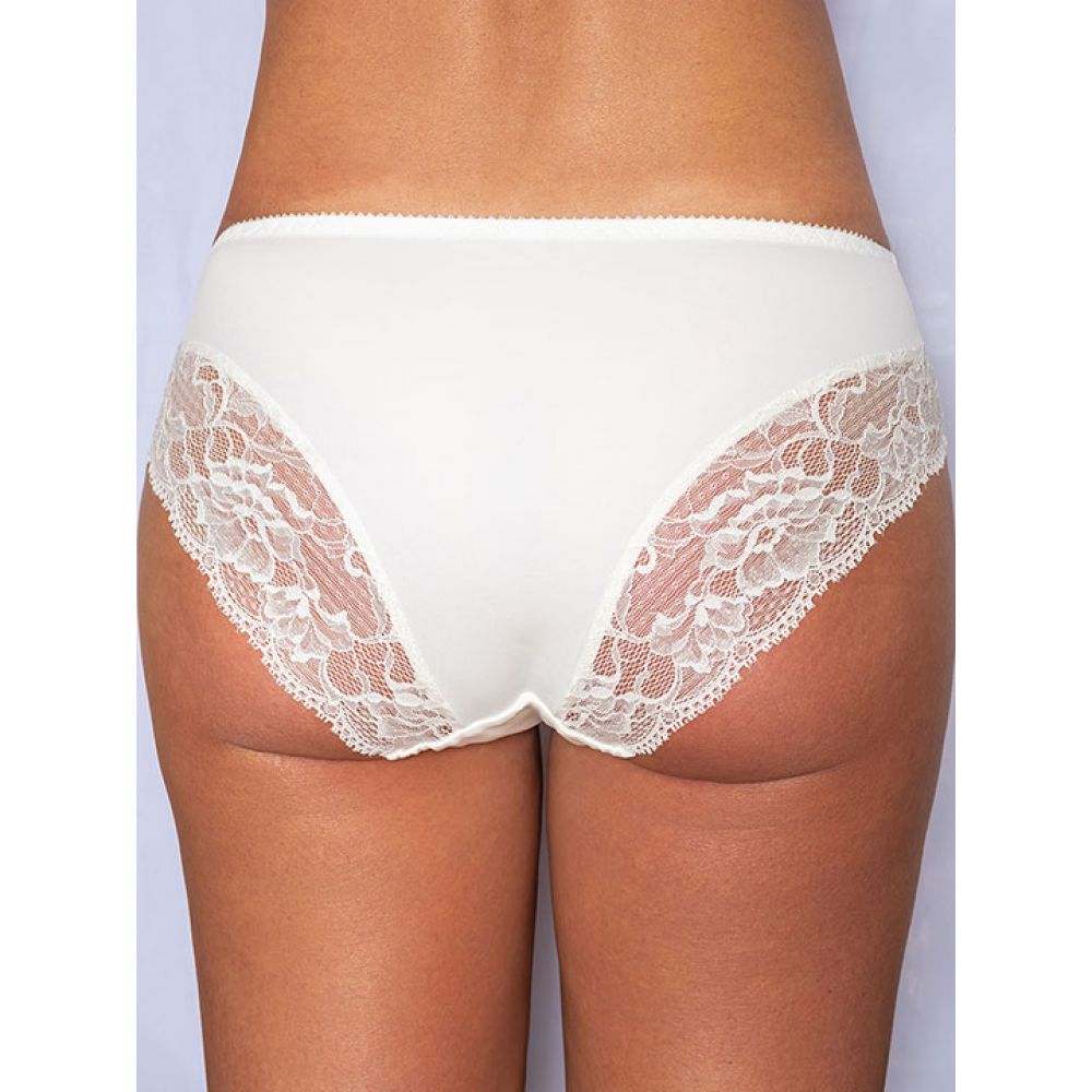 Трусы-слип комфорт с завышенной линией талии. Выполнены из набивного фактурного полотна с цветочным орнаметом, микрофибры и эластичного кружева. Срезы по краю ножек обработаны на плоскошовной машине. Украшение: атласный бантик.