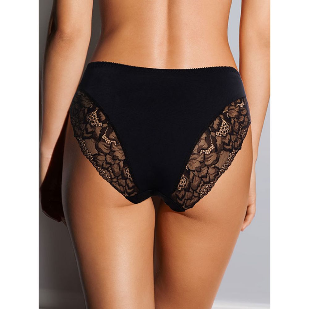 Трусы-слип комфорт с завышенной линией талии. Выполнены из эластичного кружевного полотна и эластичного кружева. Срезы по краю ножек обработаны на плоскошовной машине.
