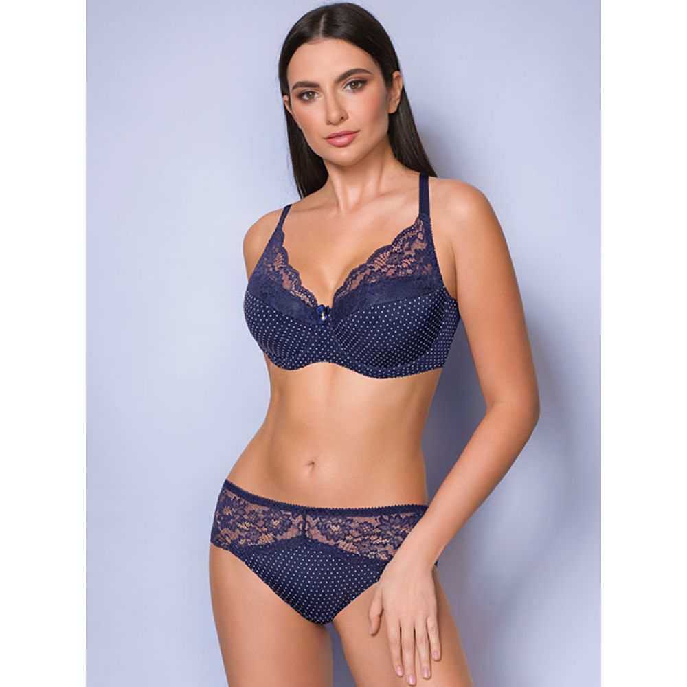 Трусы-слип (панти) со средней линией талии. Выполнены из эластичной принтованной микрофибры в горошек и эластичного кружева. Срезы по краю ножек обработаны на плоскошовной машине.