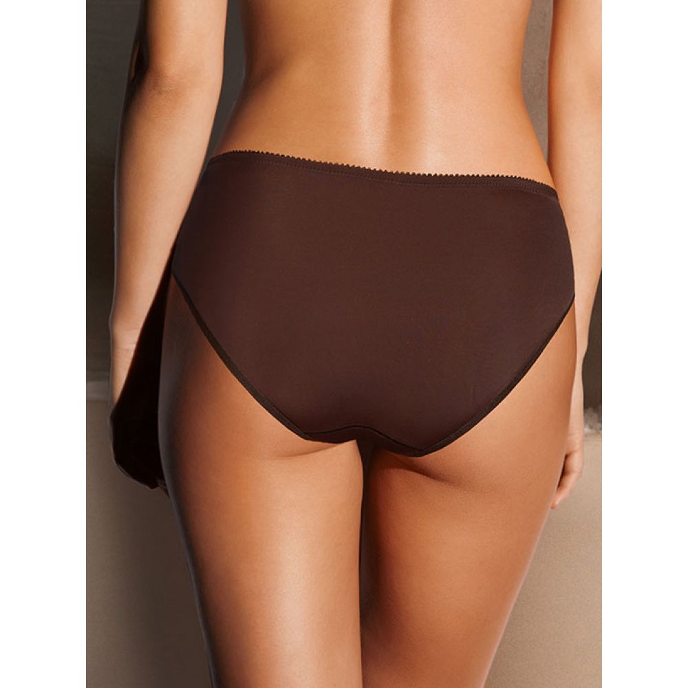 Трусы-слип со средней линией талии. Выполнены из вышивки на неэластичной сетке, микрофибры. Срезы по краю ножек обработаны на плоскошовной машине.