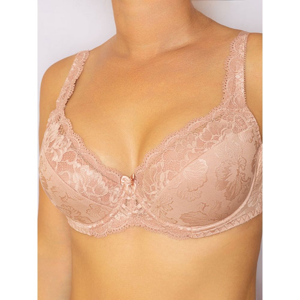 Бюстгальтер на поролоне. Выполнен из набивного фактурного полотна с цветочным орнаметом и эластичного кружева. Нижние детали чашки на дубляже с хлопком. Идеально приподнимает и поддерживает грудь, создавая красивую зону декольте. На стане бюстгальтера боковые корректирующие пластины, позволяющие прилегать к телу и не скручиваться поясу бюстгальтера, создают необходимую опору и делают силуэт более четким. Украшение: атласный бантик.