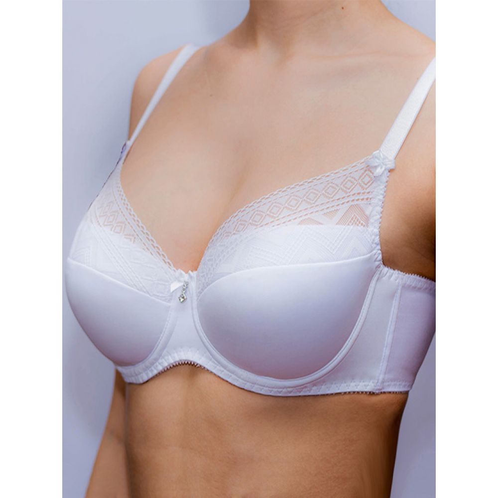 Бюстгальтер "полупоролон" из эластичного кружева с орнаментом "геометрия", эластичной микрофибры и полотна soft. Нижние детали чашек продублированы хлопком. Уникальность данной модели заключается в том, что она соединила в себе 3 конструкции: и бюстгальтер "полупоролон", и бюстгальтер на поролоне и бюстгальтер типа "балконет". Благодаря поддерживающей функции, соблазнительному дизайну и способности зрительно увеличивать грудь, его можно носить с любой одеждой.