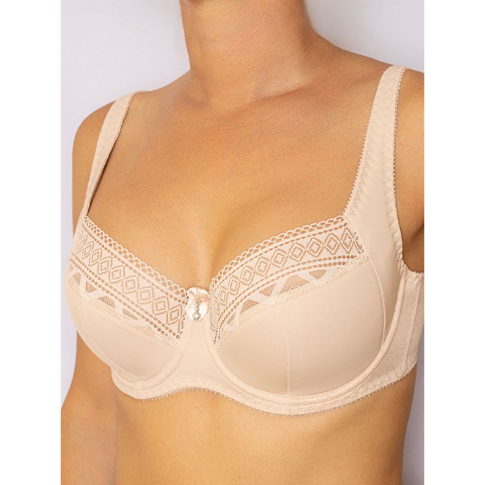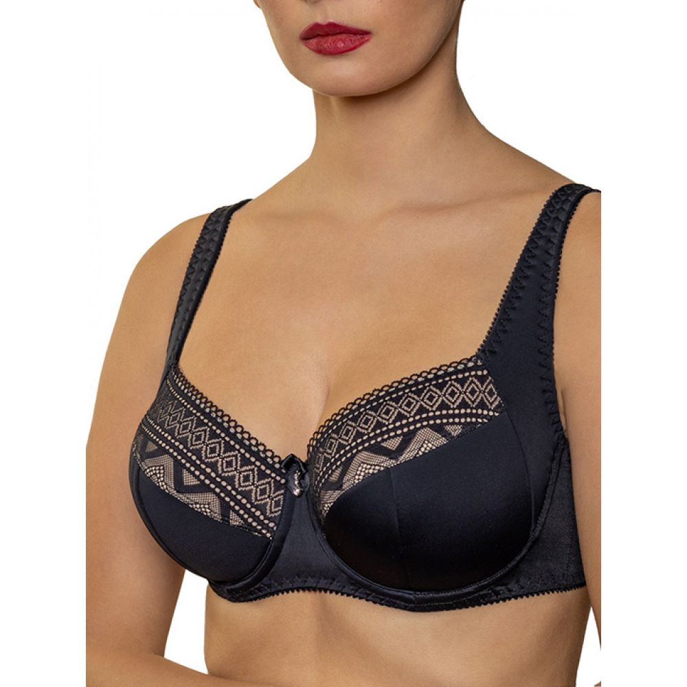 Бюстгальтер "полупоролон" с подкроем из эластичного кружева с орнаментом "геометрия", эластичной микрофибры и полотна soft. Нижние детали чашки на дубляже с хлопком. Боковой подкрой, переходящий в бретель. На стане бюстгальтера боковые корректирующие пластины, позволяющие прилегать к телу и не скручиваться поясу бюстгальтера, создают необходимую опору и делают силуэт более четким. Украшение: атласный бантик.