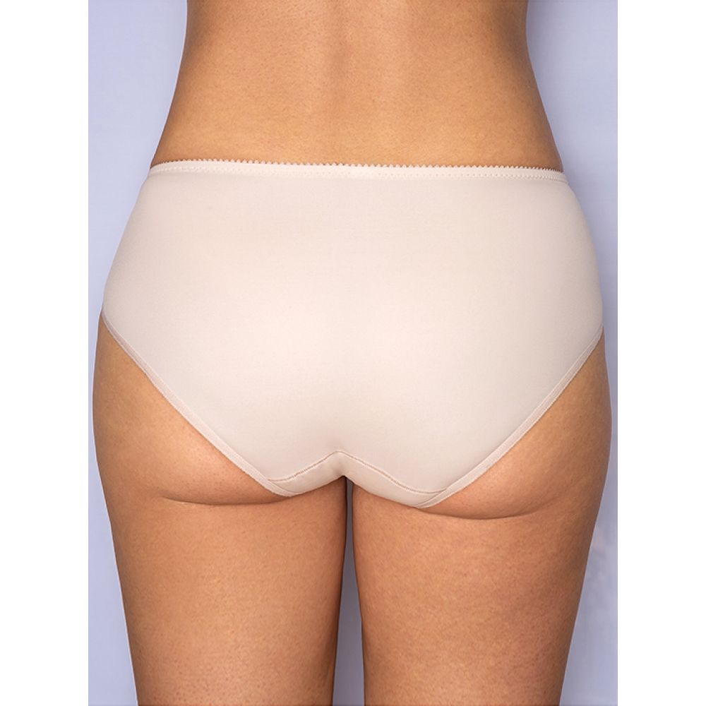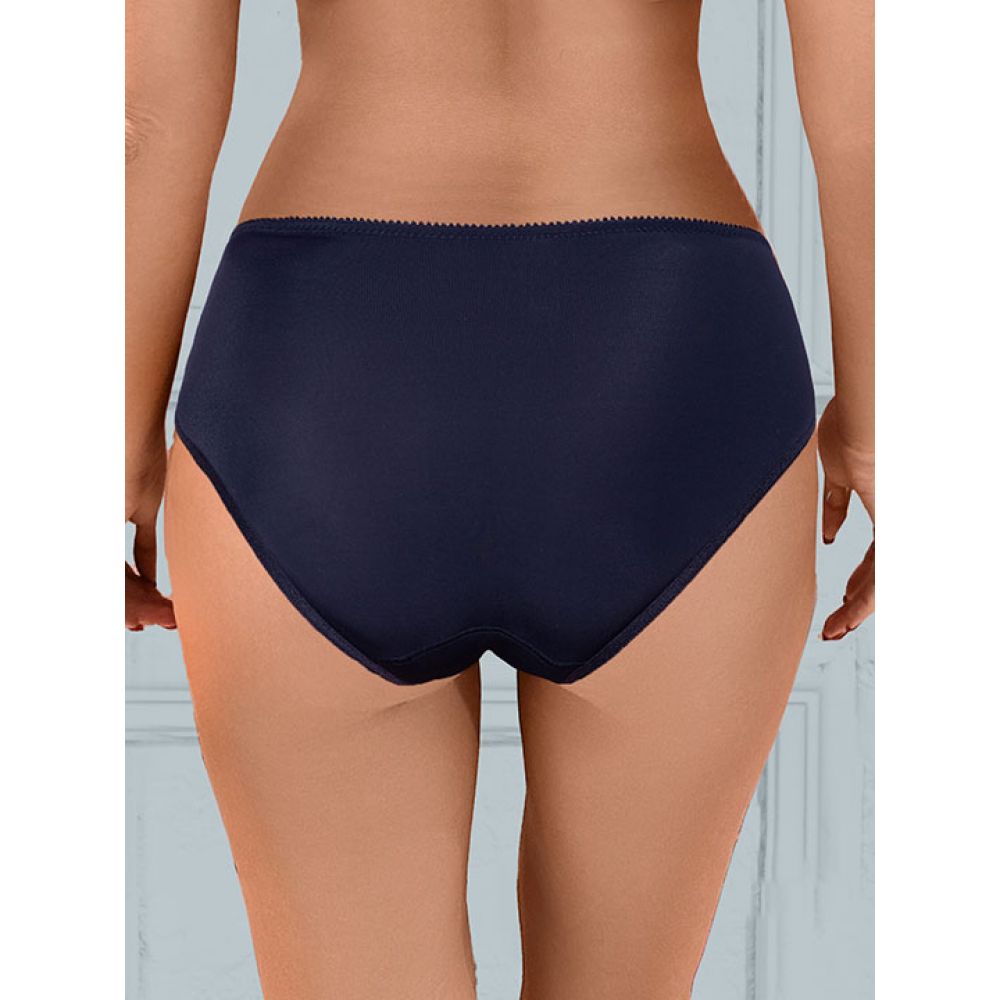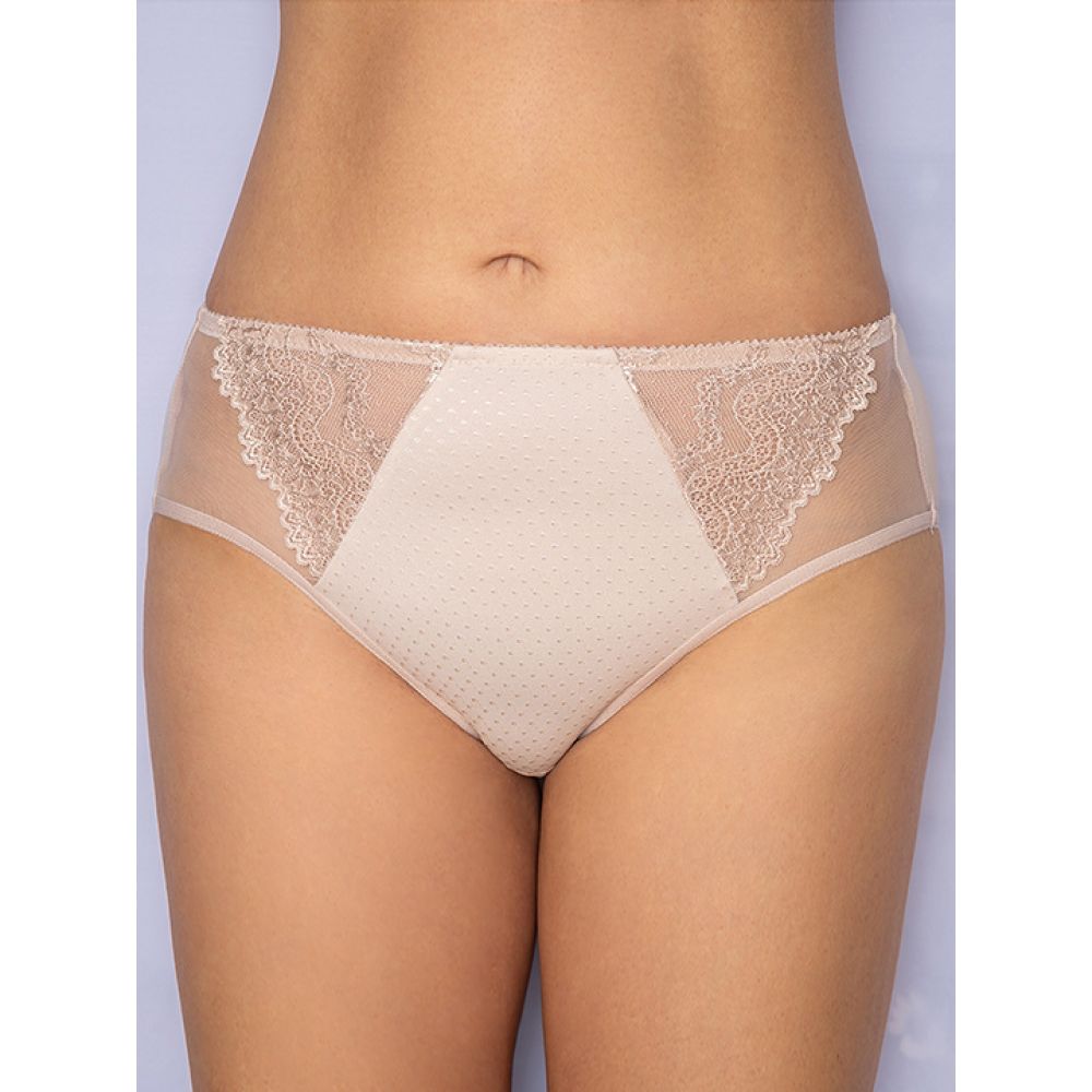 Трусы-слип комфорт макси с завышенной линией талии. Выполнены из набивной микрофибры в точку, гладкой микрофибры, эластичного кружева и сетки. Срезы по краю ножек обработаны на плоскошовной машине. Украшение: атласный бантик.