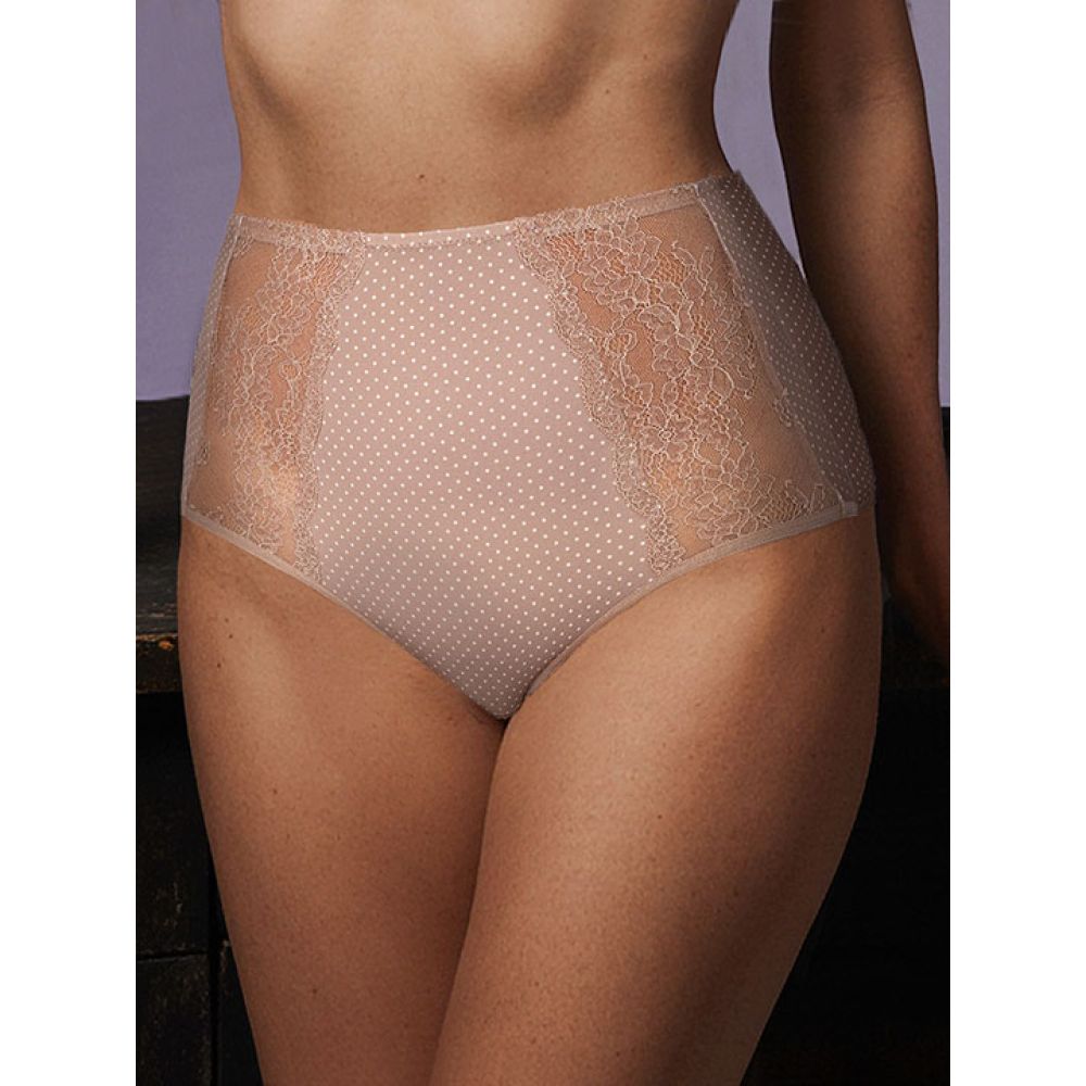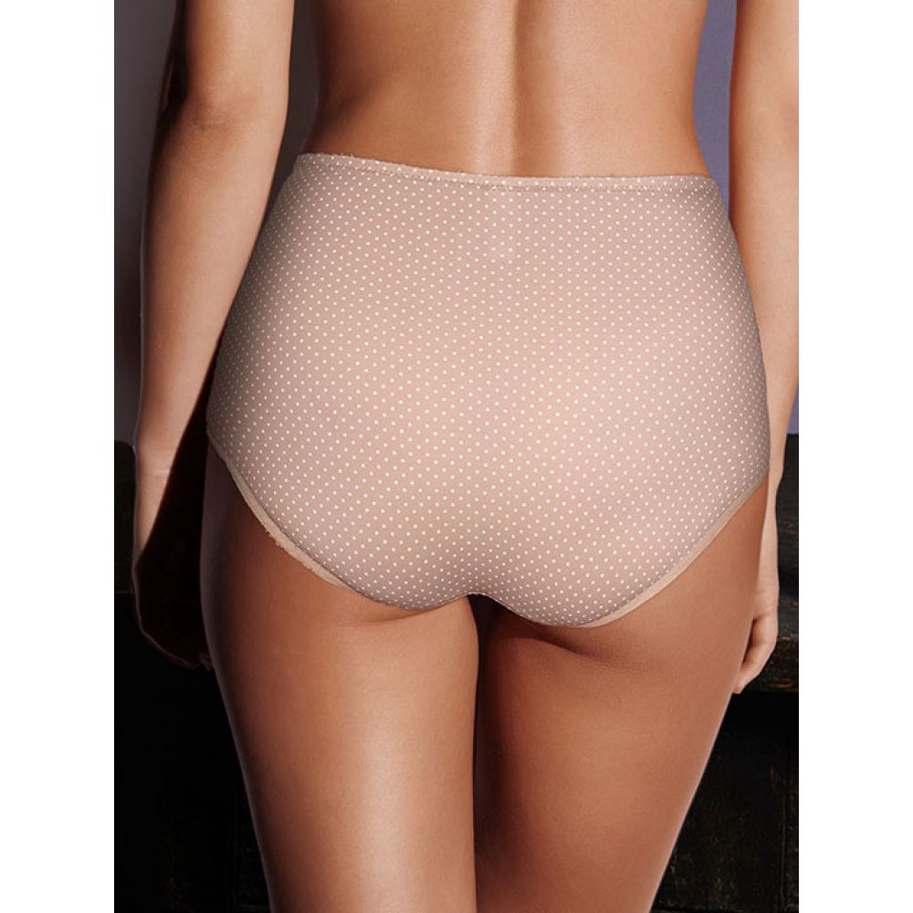 Трусы-слип комфорт макси с завышенной линией талии. Выполнены из эластичной принтованной микрофибры в горошек и эластичного кружева. Срезы по краю ножек обработаны на плоскошовной машине. Украшение: атласный бантик.