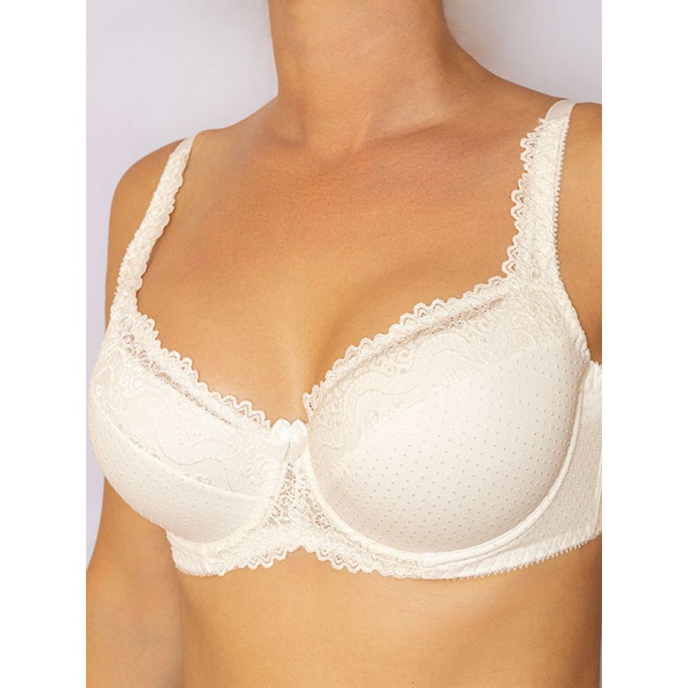 Бюстгальтер на поролоне. Выполнен из набивной микрофибры в точку и эластичного кружева. Нижние детали чашки на дубляже с хлопком. Идеально приподнимает и поддерживает грудь, создавая красивую зону декольте. На стане бюстгальтера боковые корректирующие пластины, позволяющие прилегать к телу и не скручиваться поясу бюстгальтера, создают необходимую опору и делают силуэт более четким. Украшение: атласный бантик.