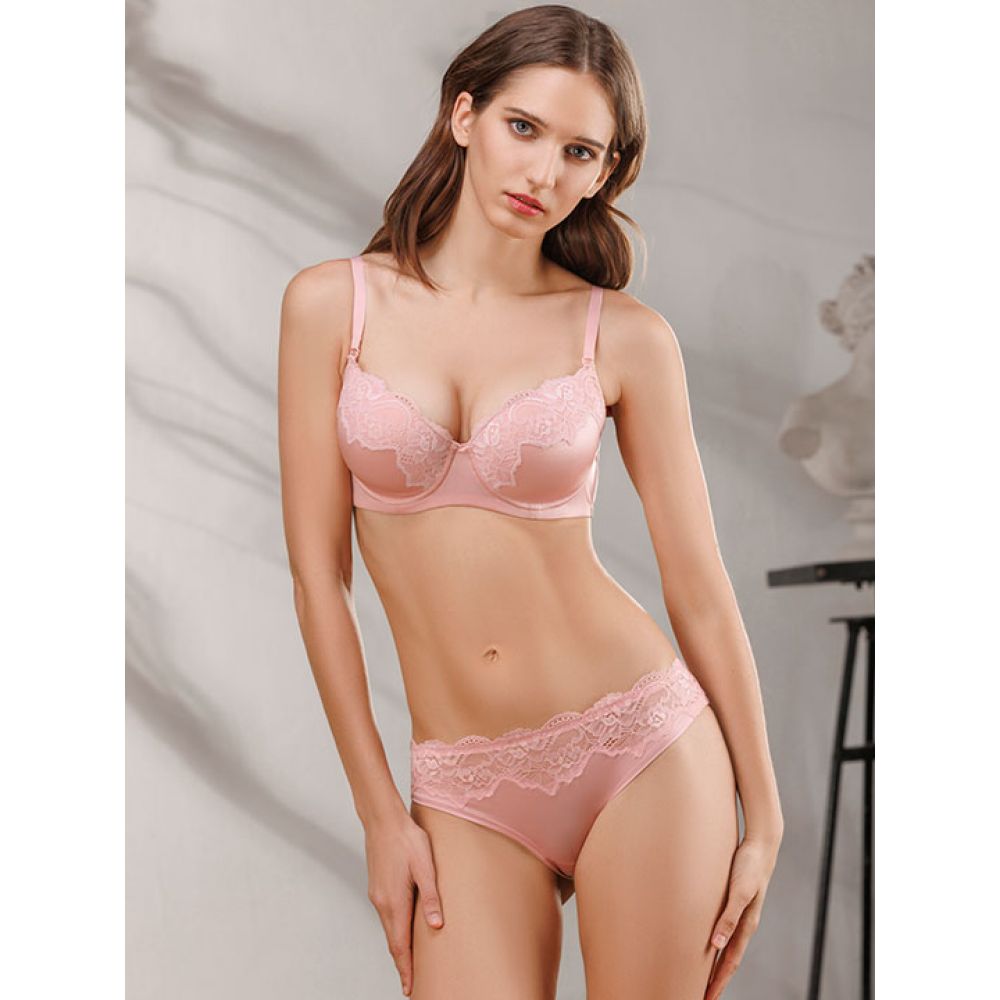 Бюстгальтер-балконет с формованной чашкой (без пуш-ап), на косточках. Центральная деталь увеличена по высоте. Чашка с расширенной косточкой отлично подбирает грудь с области проймы и создаёт объём груди в области декольте. Боковые детали усилены вертикальными косточками. Размерный ряд от 75В/80А до 90С/85D. Несъемные регулируемые бретели. Застежка в два ряда на три позиции. Выполнен из тонкого фигурного эластичного кружева и гладкой нежной микрофибры, переливающейся нежным жемчужным отблеском. По линии декольте которых искусной линией проложено утончённое кружево. Коллекция "Milana"