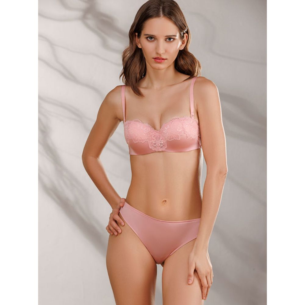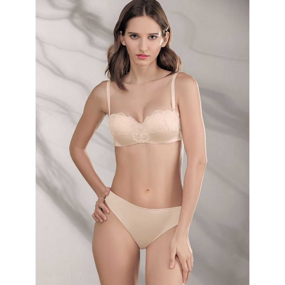Бюстгальтер анжелика, "фашия" с градуированной чашкой, на скрытых косточках. Средний размер пуш-ап, увеличивает грудь на +1 размер. Хит ТМ Амели, знакомая по моделям 8011, 2017. Резинки на спинке усилены силиконом, что позволяет носить модель без бретелей. Боковые детали усилены вертикальными косточками. Отстегивающиеся бретели. Застежка в два ряда на три позиции. Выполнен из из тонкого фигурного эластичного кружева и гладкой нежной микрофибры, переливающейся нежным жемчужным отблеском. По линии декольте которых искусной линией проложено утончённое кружево. Коллекция "Milana"