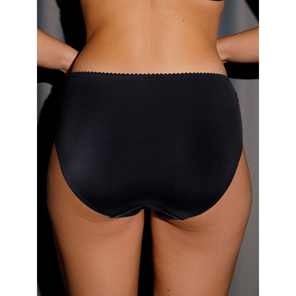 Трусы-слип комфорт со средней линией талии. Выполнены из эластичного шелковистого полотна с сатиновым блеском и украшены вставками из вышивки. Выполнены из неэластичной вышивки и эластичного полотна с блеском.