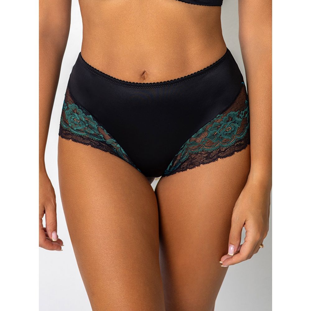 Трусы-слип комфорт с завышенной линией талии. Выполнены из эластичного полотна с сатиновым блеском и эластичного кружева.
