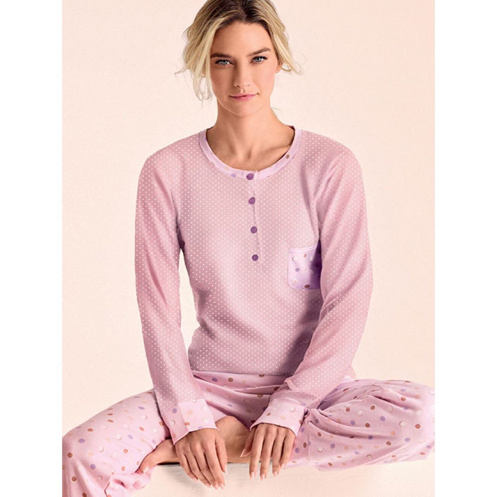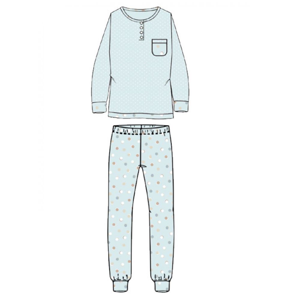 Пижама: кофта с длинным рукавом и брюки на манжетах. Застежка - четыре пуговицы на планке. Выполнена из интерлока.