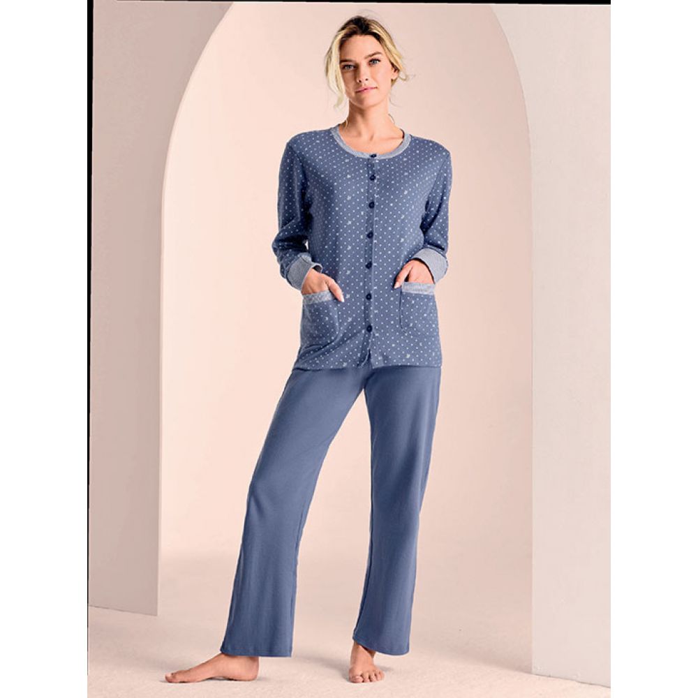 Пижама: кофта с длинным рукавом, на пуговицах, и прямые брюки. Выполнена из интерлока.
