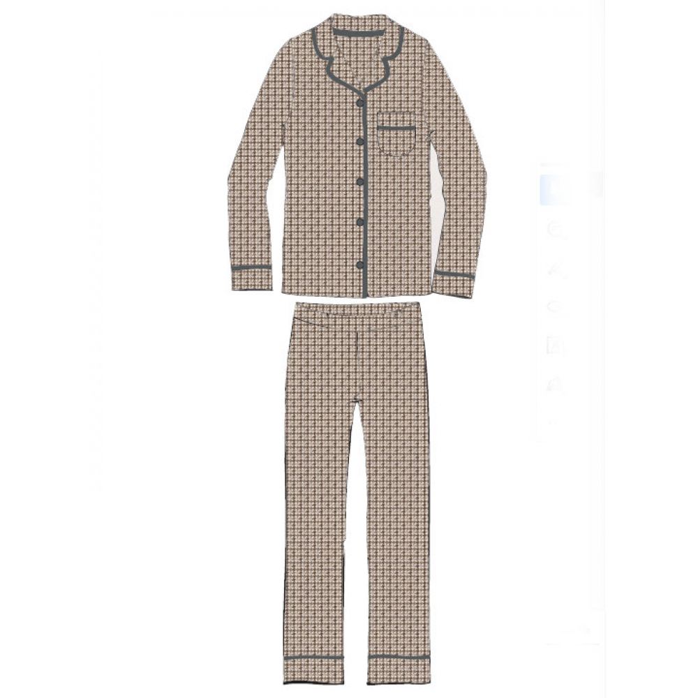 Пижама: рубашка с отложным воротничком и длинным рукавом, на пуговицах, и прямые брюки. Выполнена из флиса.