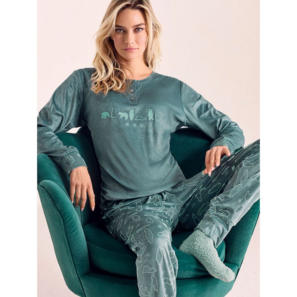 Пижама: кофта с длинным рукавом и брюки на манжетах. Застежка - три пуговицы на планке. Выполнена из флиса.