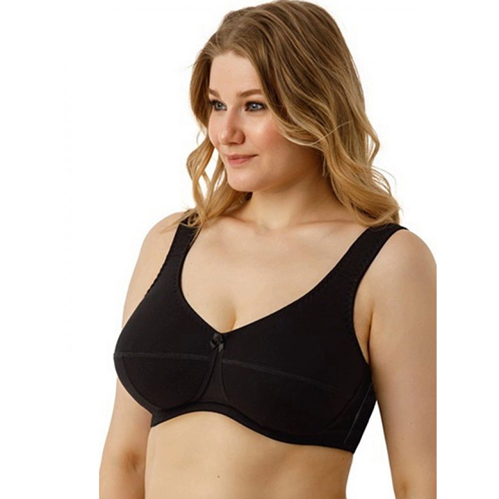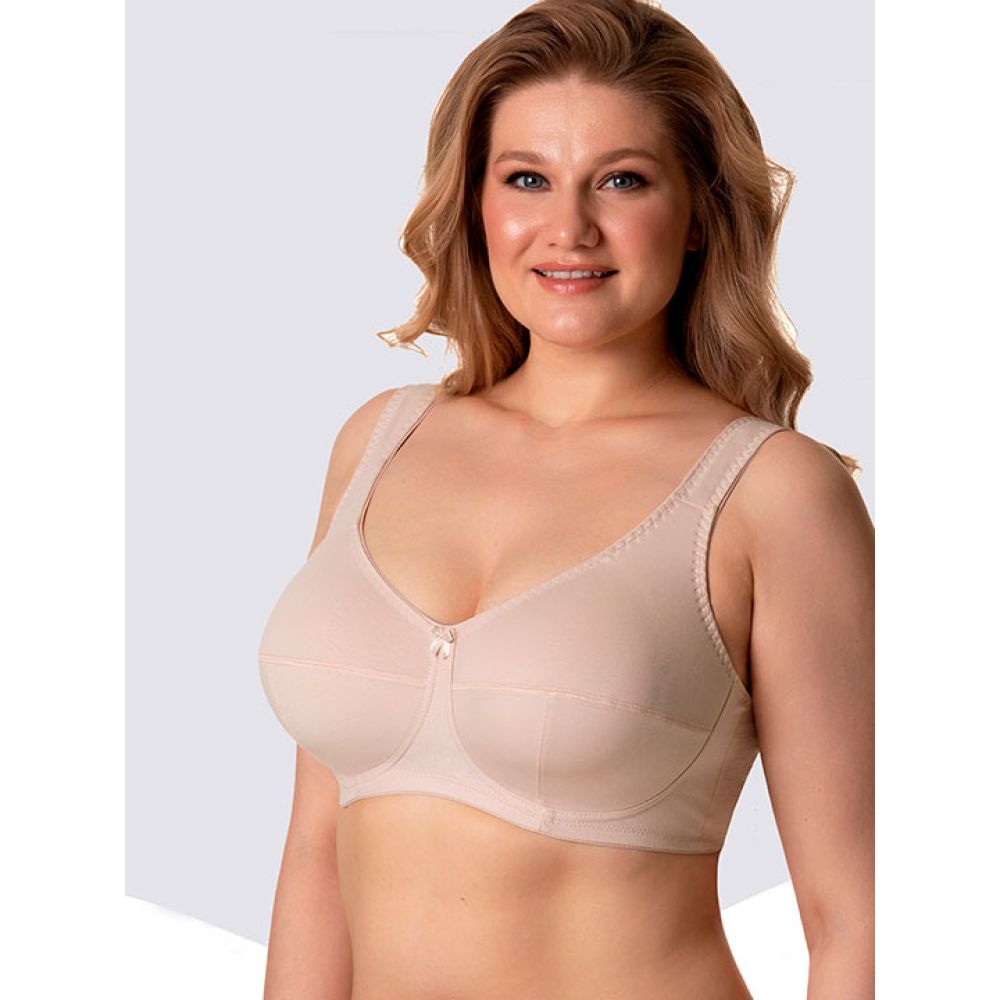 Бюстгальтер без каркасов с мягкой чашкой. Чашки Т-образного членения высоко приподымают грудь и создают округлую наполненную форму. Усиленная бретель снимает нагрузку с плечевого пояса. Широкий стан плотно облегает тело и обеспечивает стабильную комфортную посадку бюстгальтера на фигуре.