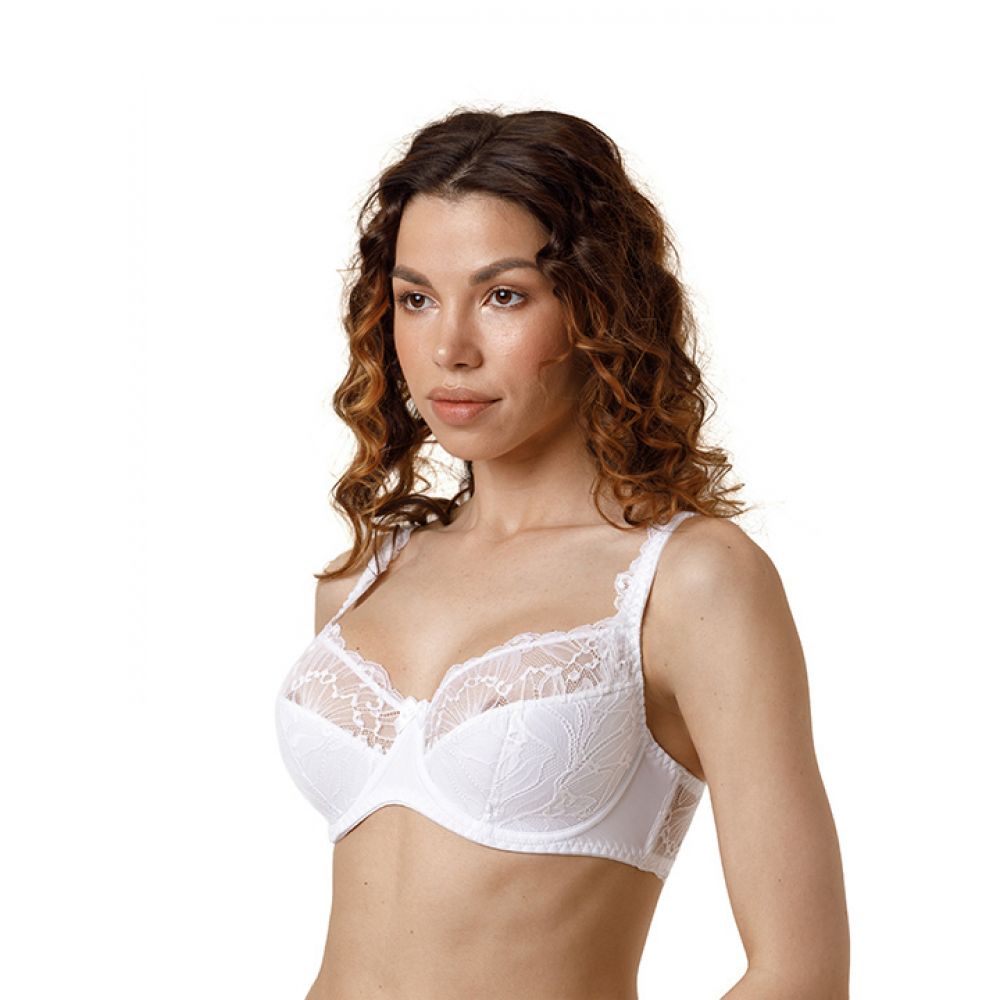 Бюстгальтер полудублированный. Чашка из эластичного кружева. Внутренняя часть стана и передняя часть чашки на подкладке из 100% хлопка. В больших размерах боковые детали усиленны сетчатой подкладкой. Верхняя часть бретели и боковая часть стана из эластичного кружева, боковые пластины надежно фиксуруют стан.