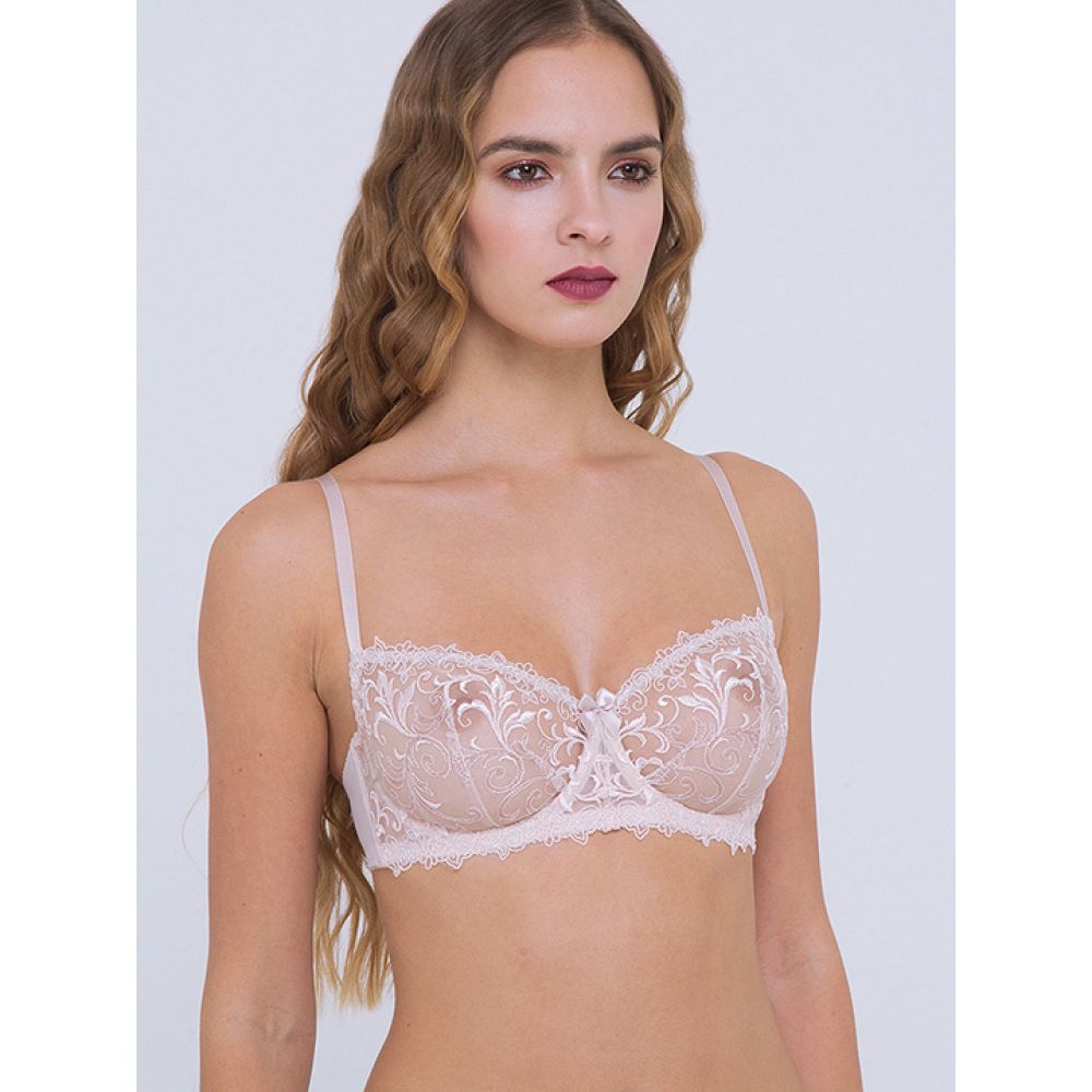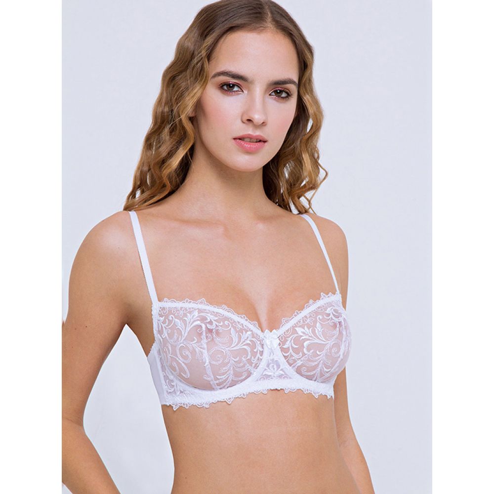 Модель с легкими, полупрозрачными чашками из изысканного шитья по ажурной сетке. Благодаря оригинальному крою чашек с двумя разнонаправленными вытачками бюстгальтер создаёт идеальную округлую форму груди.