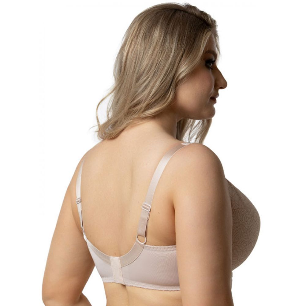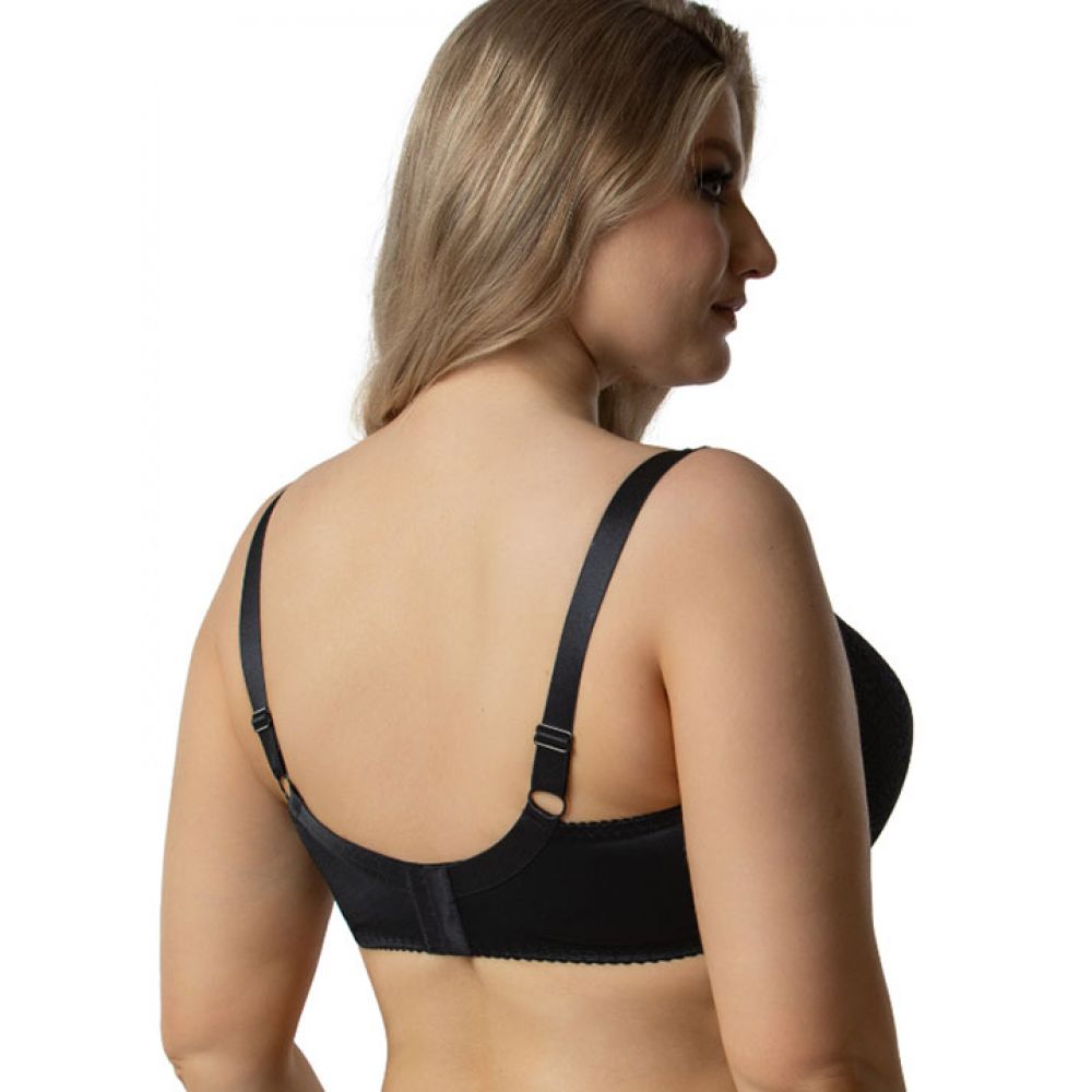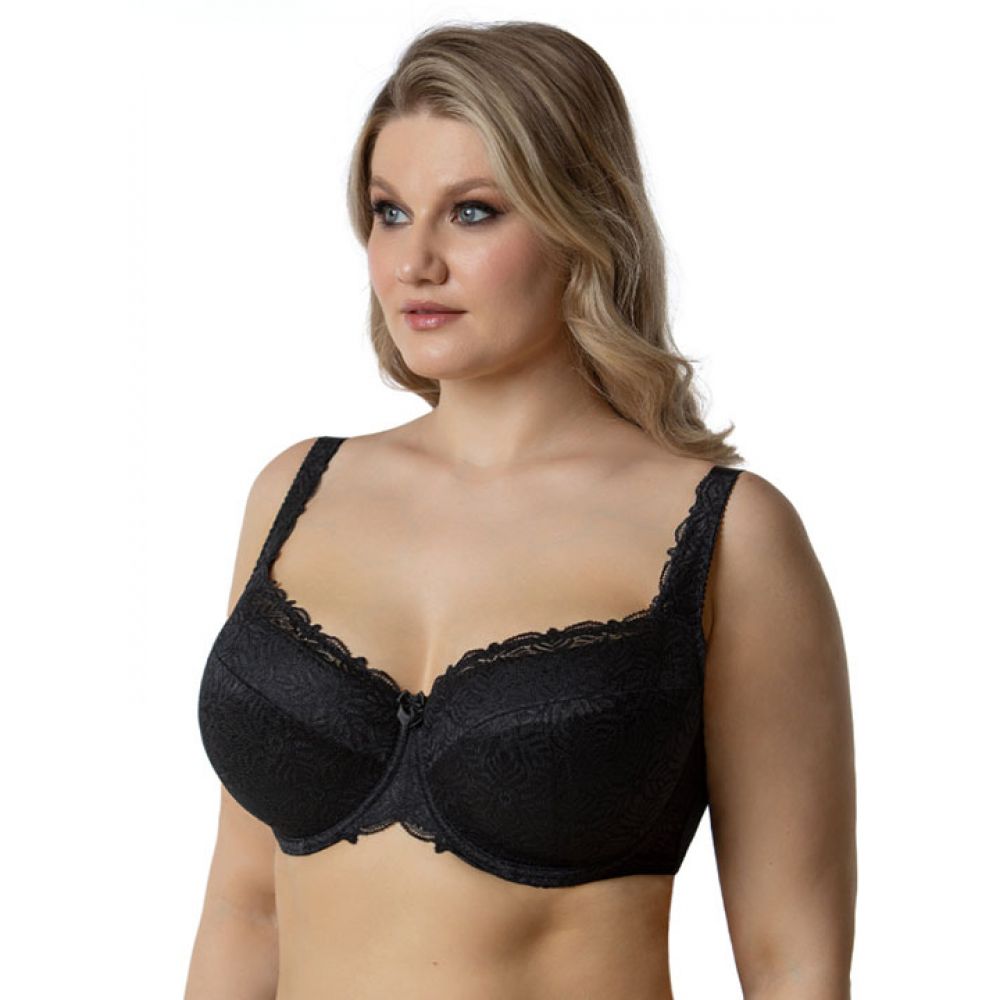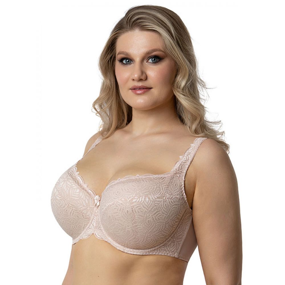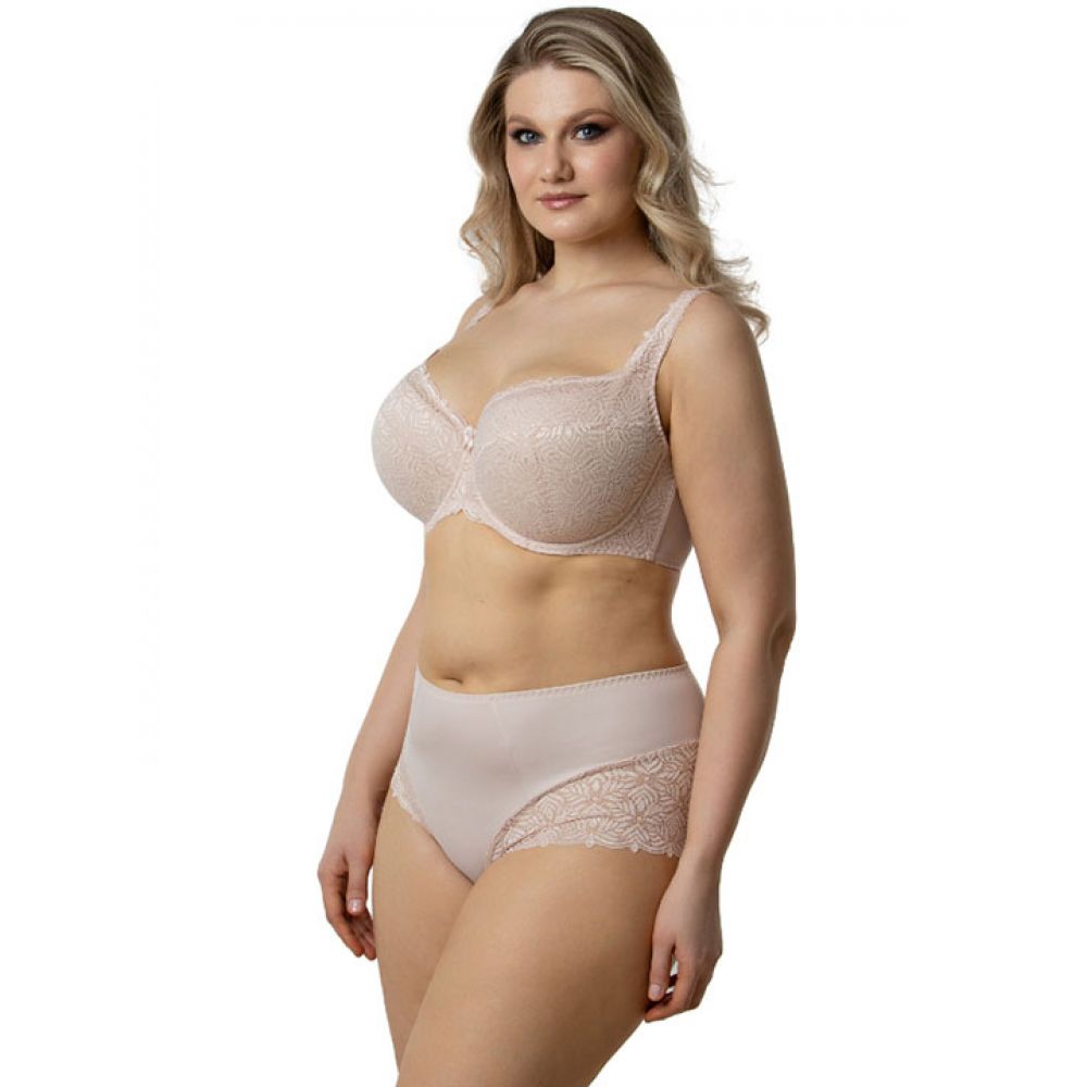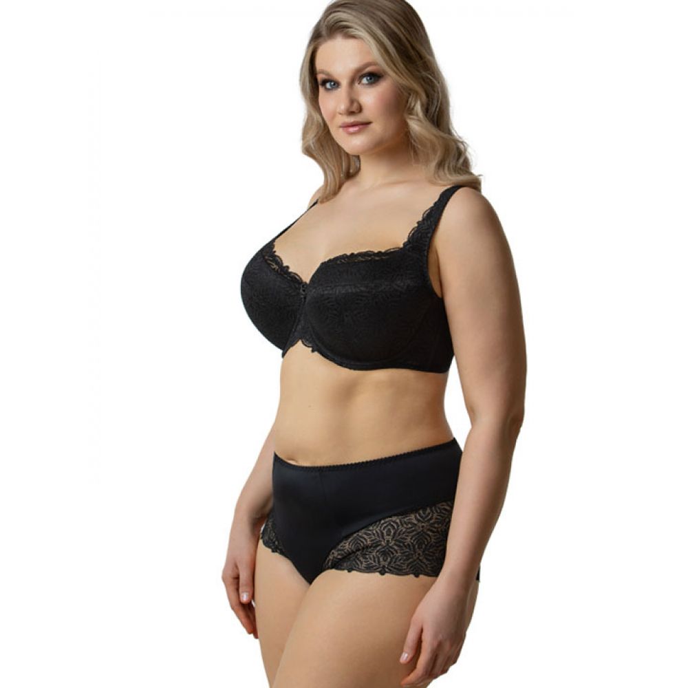 Бюстгальтер на каркасах с дублированной чашкой. Чашки овальной формы с диагональным членением создают округлую наполненную форму. Кружевная верхней детали чашки шире дублированного основания, что в сочетании с широкой кружевной отделкой бретели позволяет