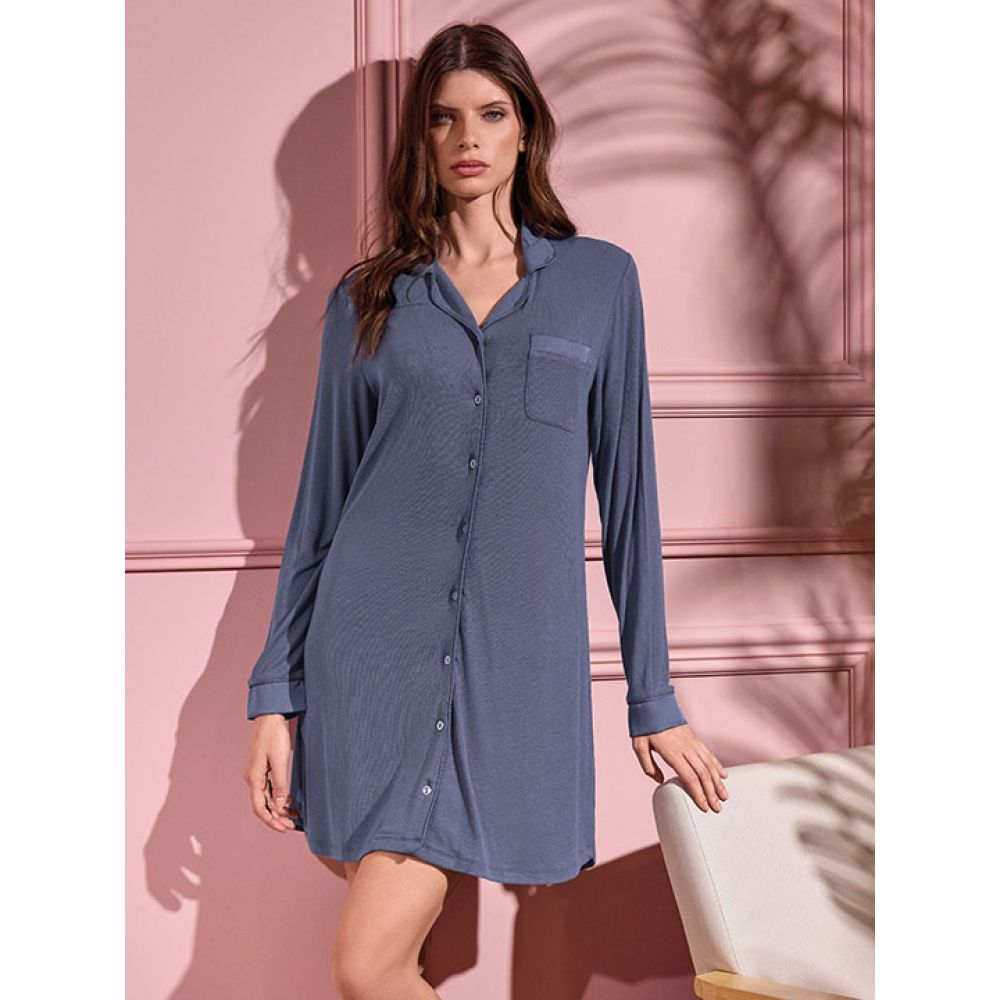 Длинная рубашка на пуговицах с отложным воротником, слева на груди накладной карман, длинные рукава с манжетами. Комплект изготовлен из мягкой струящейся однотонной вискозы и украшен вставками из глянцевой ткани в тон. Коллекция "Yoga"