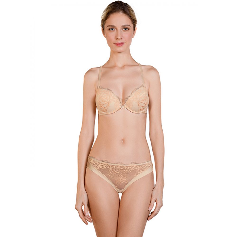 Комплект: бюстгальтер пуш-ап среднего размера с гелевой чашкой Matera и трусики-бразильяна со средней линией талии. Несъемные регулируемые бретели. Застежка в два ряда на три позиции. Высота бочка трусиков 6 см. Выполнен из биколорного кружева. Коллекция "Luna".