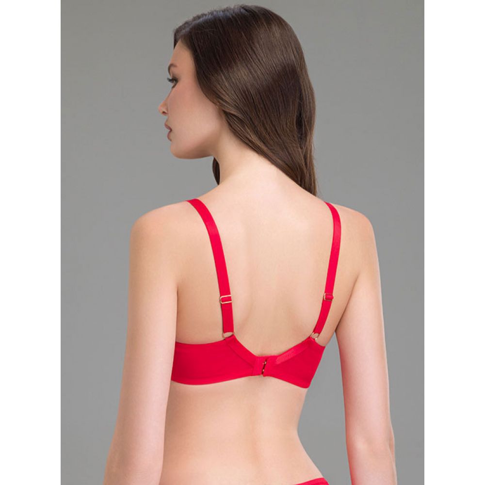 Бюстгальтер с мягкой чашкой Imola, на косточках. Эффект пуш-ап достигается за счет кроя: смещённый немного вверх T-образный шов чашки, не пережимающий грудь. Усиленная поддерживающей сеткой нижняя часть чашки, поднимает и моделирует округлые формы. Регулируемые бретели, переходящие на спинке в маечную форму, а также продублированные эластичной сеткой крылья бюстгальтера и боковые косточки дают усиление поясу для лучшей поддержки тяжелой груди. Выполнен из утонченного кружева и сетки с диагональной полоской. Коллекция "Scarlett".
