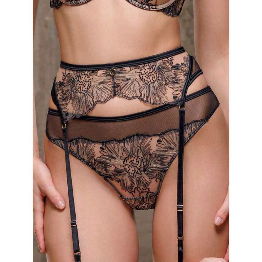 Пояс для чулок. Передняя деталь из вышивки, задняя деталь из полупрозрачной эластичной сеточки в обрамлении мягких сатиновых окантовок. Регулируемые по длине чулкодержатели пояса обеспечивают комфортную поддержку чулка. Застёжка пояса на два крючка имеет регулировку по ширине на три позиции. Сочетает в себе изысканную вышивку и полупрозрачную эластичную сеточку с нюдовой подложкой. Золотой люрекс в вышивке переликается с фурнитурой и декоративным колечком. Использован эластичный сатин в оформлении бретелей, основания чашек и задней детали. Коллекция "Beatriсe".