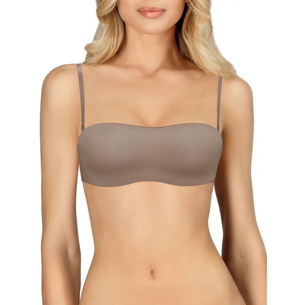 Бюстгальтер бандо с двуслойными мягкими чашками на скрытых косточках. Бочок усилен вертикальными, гибкими пластинами для лучшей посадки. По всему верхнему краю бюста и низу боковых деталей проложена силиконовая лента для лучшей фиксации на стане. Отстегивающиеся бретели. Застежка в два ряда на четыре позиции. Модель со скрытыми швами. Выполнен из эластичной, мягкой микрофибры. Коллекция "Fantastic".