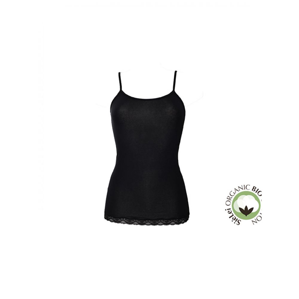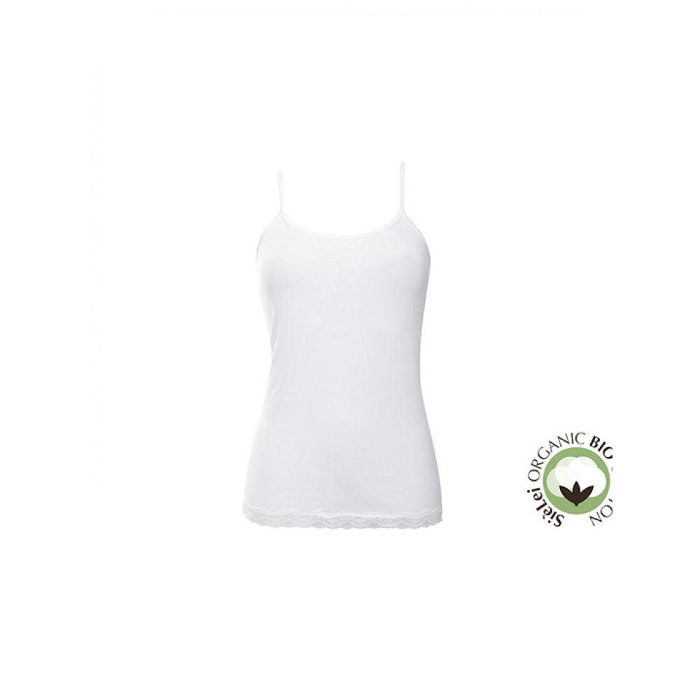 Майка на узких бретелях, декорирована кружевом по подолу. Изделие выполнено из органического хлопка, собранного вручную, без вредных веществ. Гипоаллергенно.