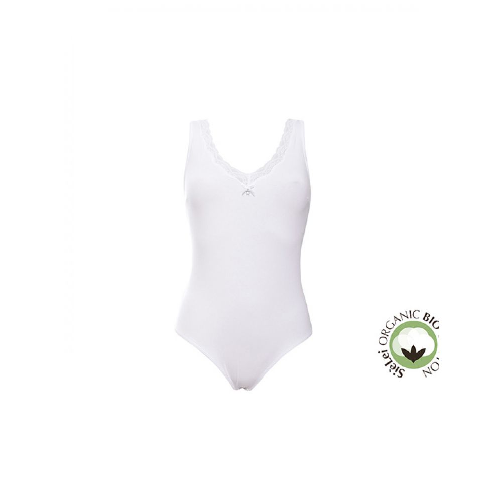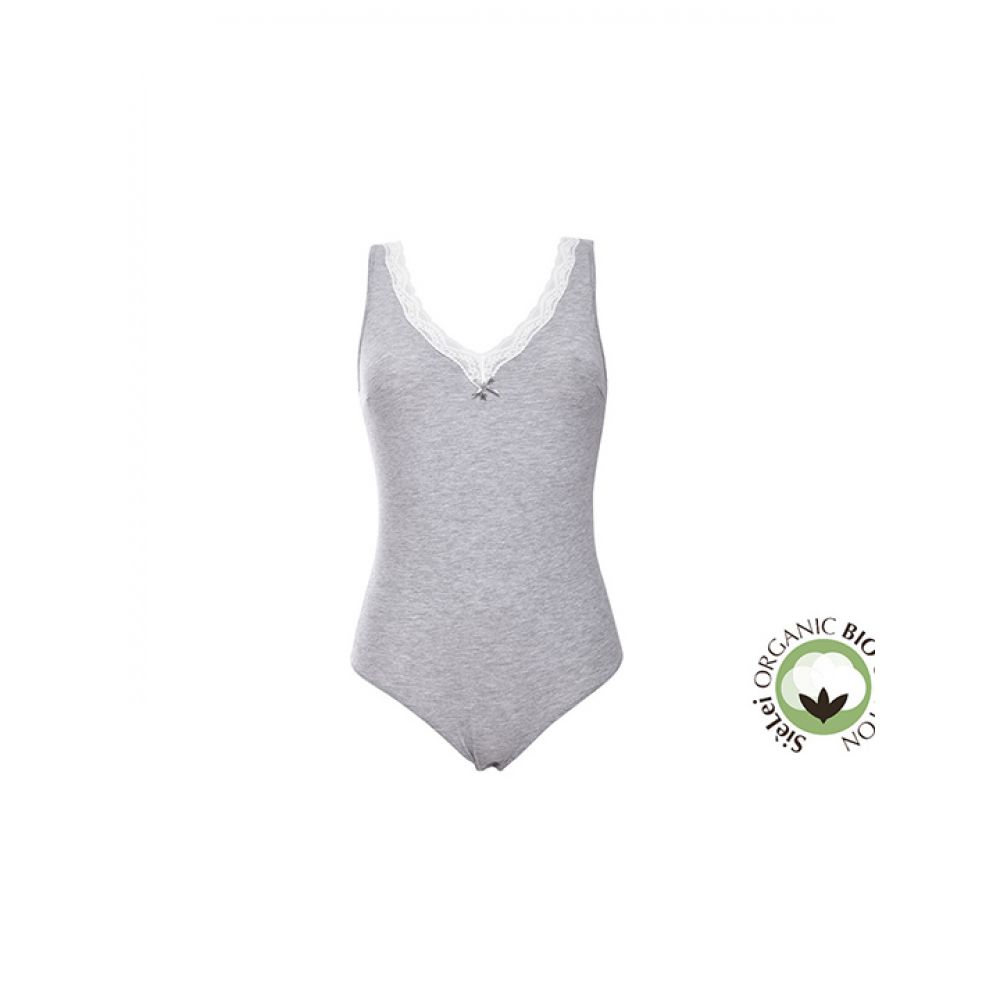 Боди без чашки, с V-образным вырезом, отделанным кружевом. Изделие выполнено из органического хлопка, собранного вручную, без вредных веществ. Гипоаллергенно.