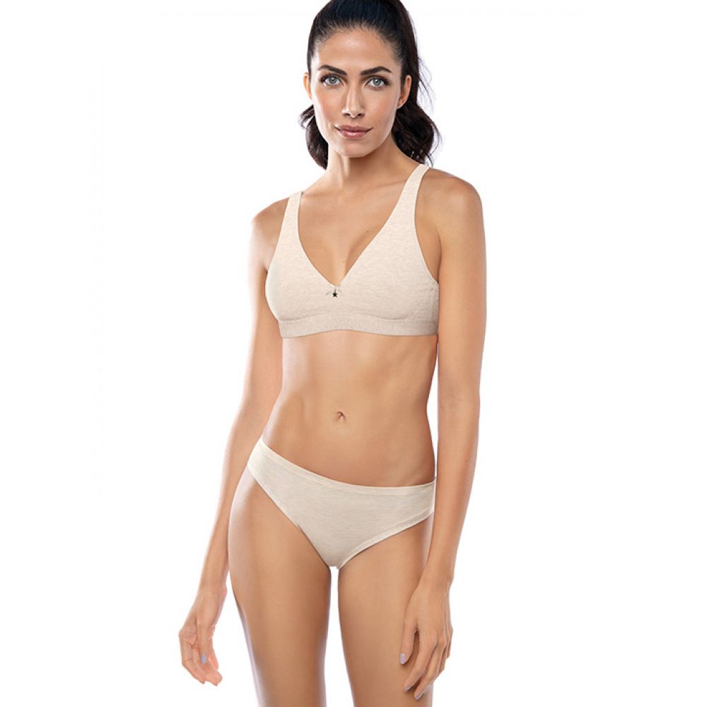 Бюстгальтер-триангул с мягкой чашкой из двух слоев ткани, без косточек. Бочок усилен вертикальными пластинами и выполнен из двух слоев хлопка. По всему нижнему краю изделия проходит широкая резинка, обтянутая хлопком, для лучшей посадки. Несъемные, регулируемые бретели. Изделие выполнено из органического хлопка, собранного вручную, без вредных веществ. Гипоаллергенно.