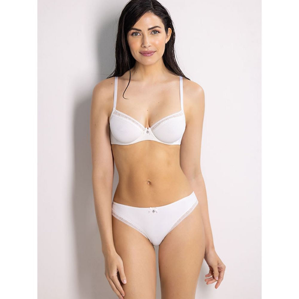 Бюстгальтер с мягкими чашками, на косточках. Несъемные регулируемые бретели. Застежка в 2 ряда на 4 позиции. Выполнен из рельефной микрофибры, что придаёт современность и утончённую привлекательность. Украшен кружевной отделкой и бантиком с кулоном в форме сердечка, благодаря чему становится настоящей драгоценностью женского белья. Коллекция "Darling".