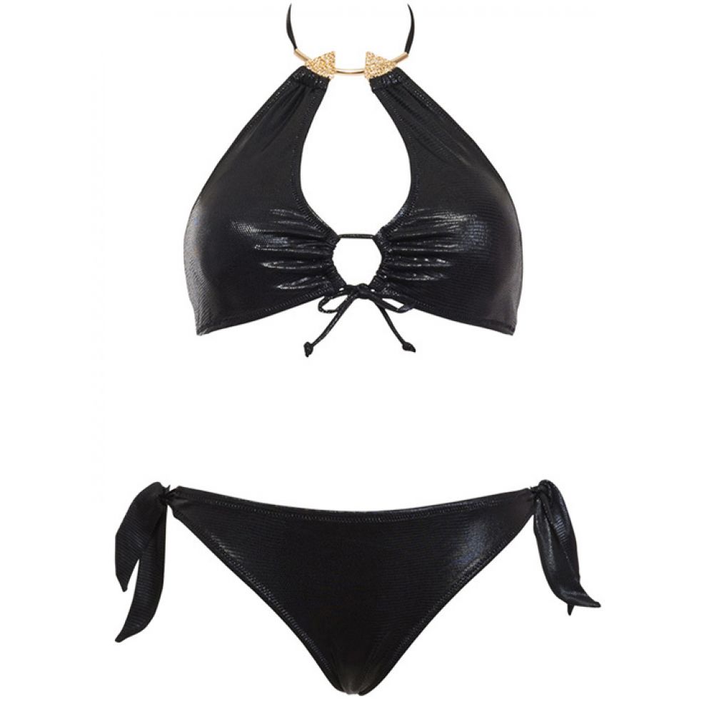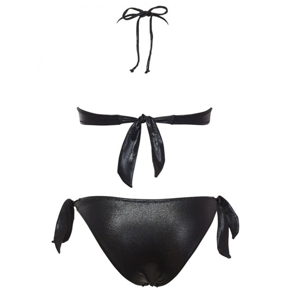 Раздельный купальник: бюстгальтер-топ с мягкой (без вкладышей) чашкой без косточек. Бретель через шею. Застежка-завязка на спинке. Трусики-слип на завязках.