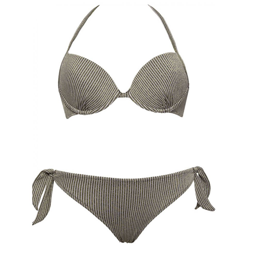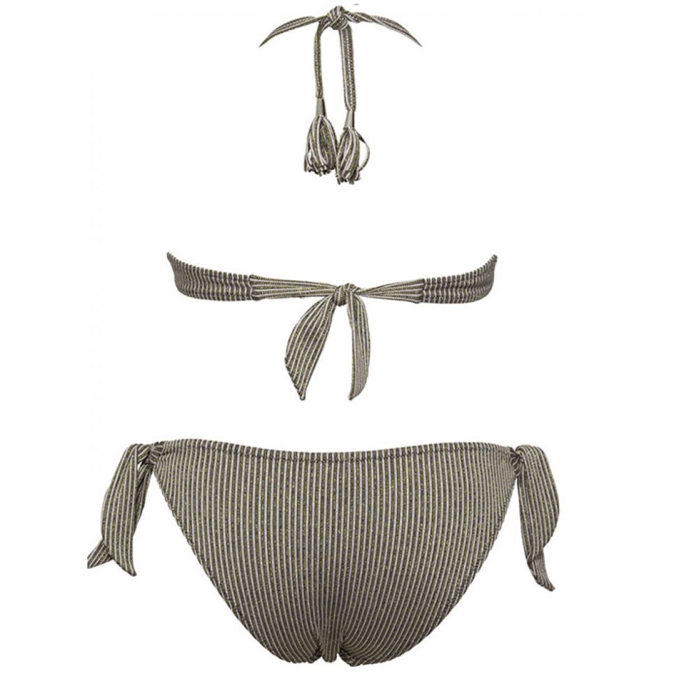 Раздельный купальник: бюстгальтер с формованной чашкой (без пуш-ап) на косточках. Застежка- завязка на спинке. Бретель - завязка через шею. Трусики-слип на завязках.