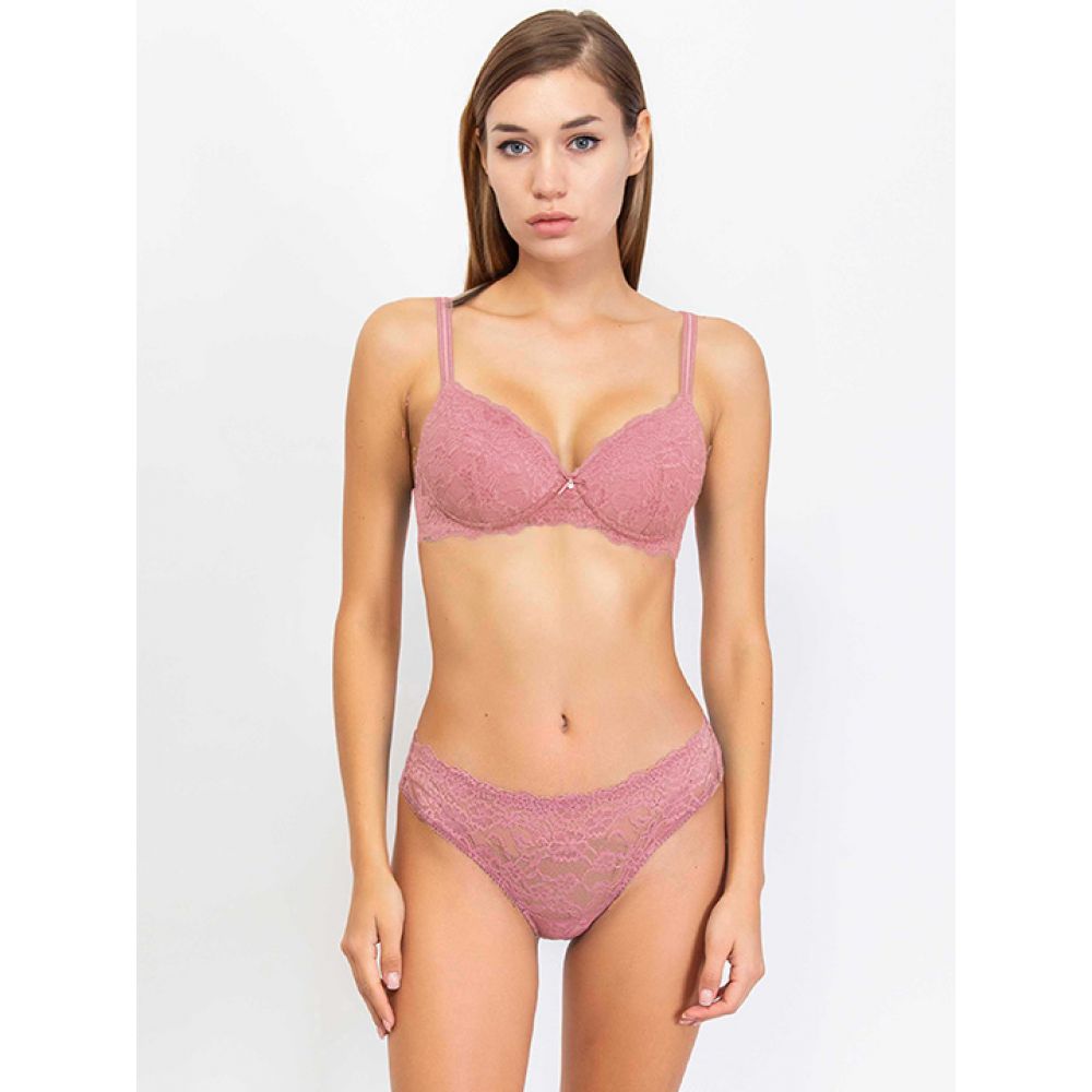 Комплект: бюстгальтер-балконет с формованной чашкой с наполнителем Memory, на косточках, и трусики-бразилиана со средней линией талии. Бретели несъемные, регулируемые. Застежка в 2 ряда на 4 позиции. Высота бочка трусов 5 см. Выполнен из мягкого кружева с цветочным рисунком. Коллекция "Allure".