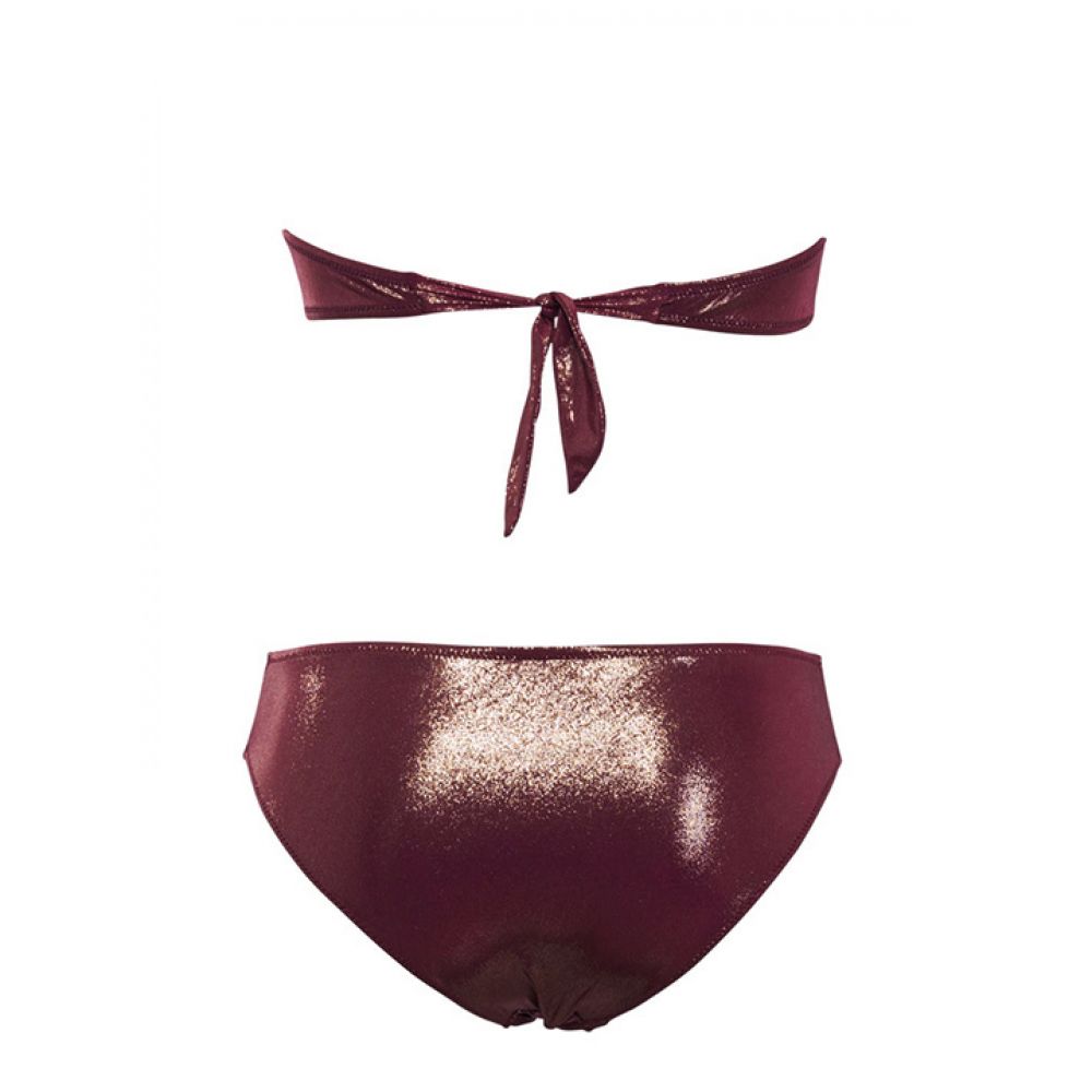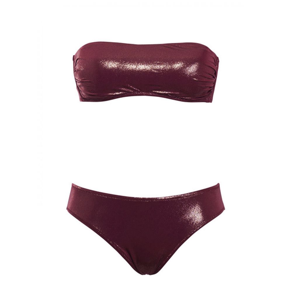 Раздельный купальник: бюстгальтер-бандо с мягкой чашкой без косточек со съемными формованными вкладышами (без пуш-ап) и трусики-слип, высота бочка 5 см. Бочок усилен костью. Отстегивающаяся бретель через шею. Застежка- завязка на спинке. Выполнен из тонко