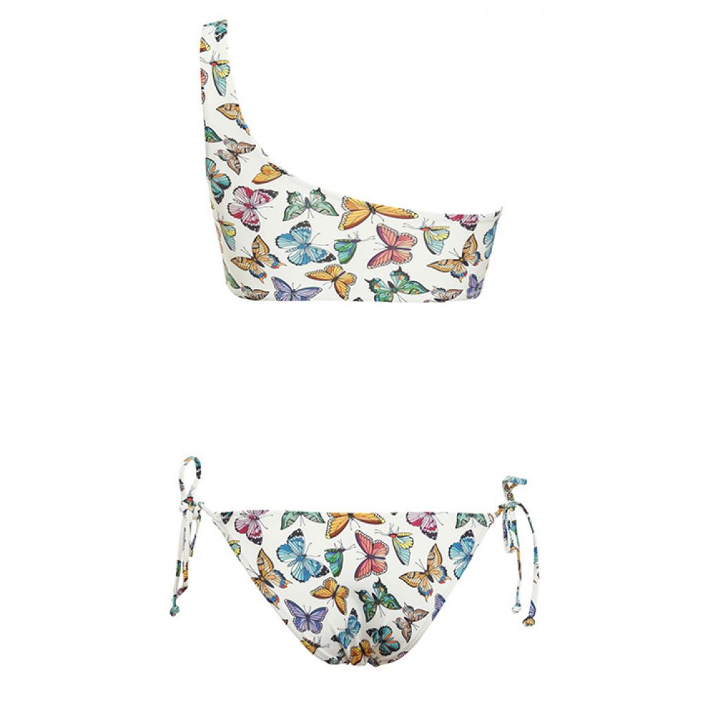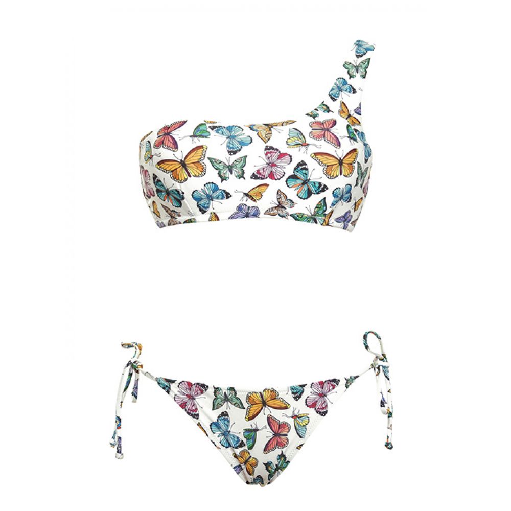 Раздельный купальник: топ с мягкой чашкой на скрытых косточках со съемными формованными вкладышами без пуш-ап, бочок усилен костью. Трусики-танга на завязках.