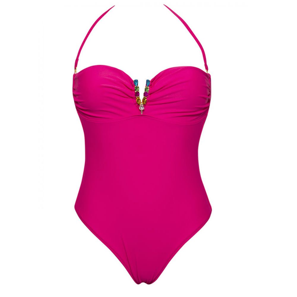 Совместный купальник без косточек, мягкая чашка, съемные формованные вкладыши без пуш-ап, бочок усилен костью. Застежка - завязки на спине. Отстегивающаяся бретель через шею.