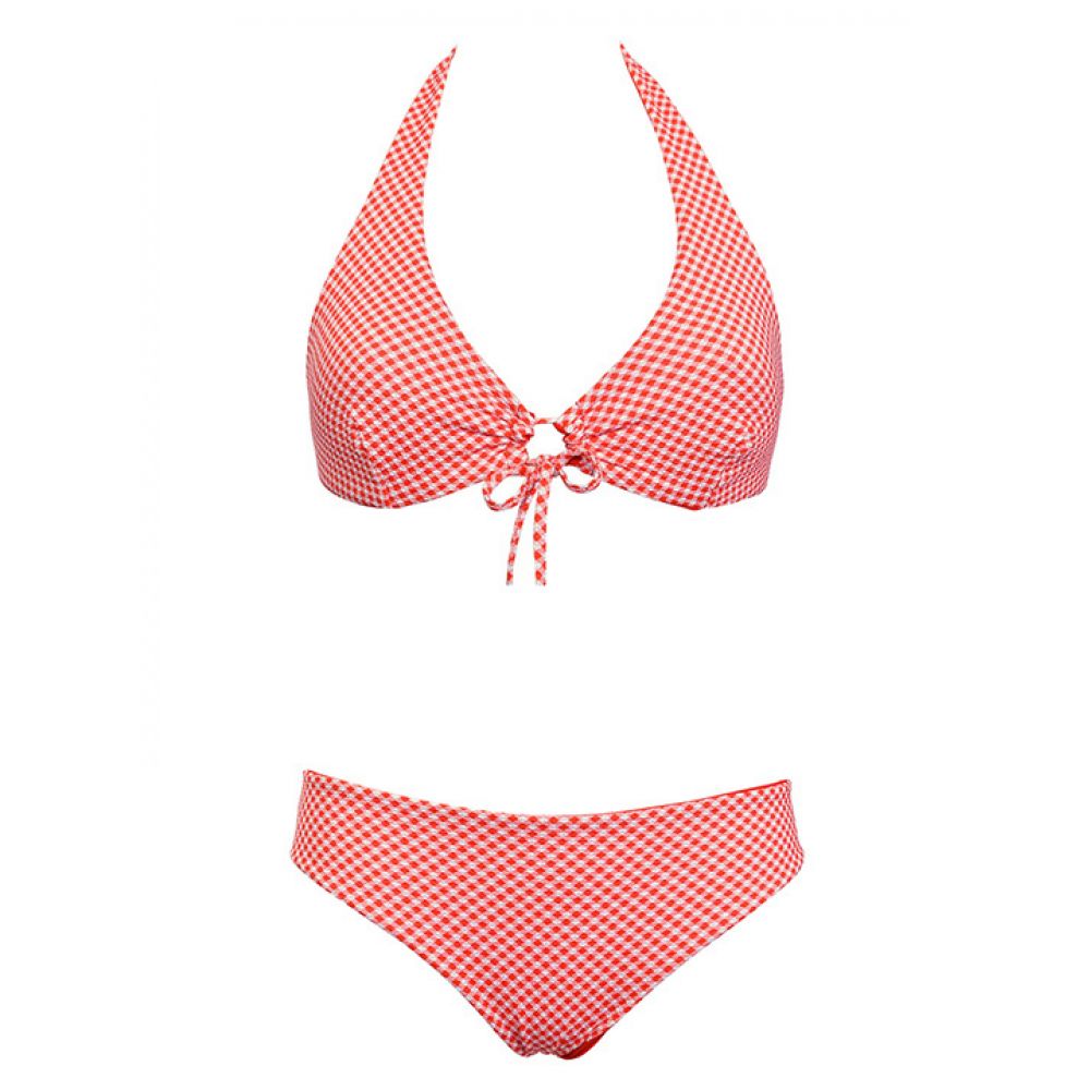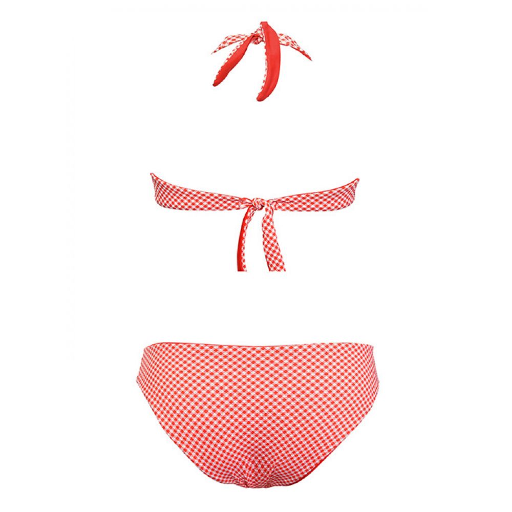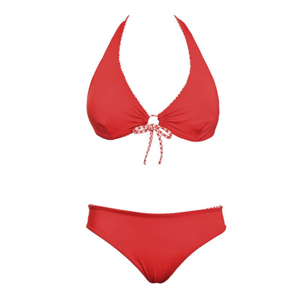 Двусторонний раздельный купальник: бюстгальтер с мягкой чашкой (без вкладышей) без косточек и трусики-слип, высота бочка 5 см. Застежка- завязка на спинке.