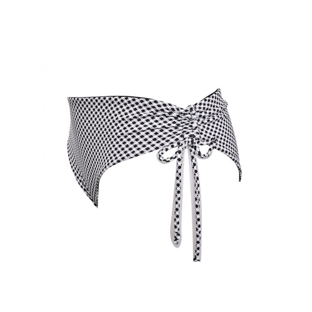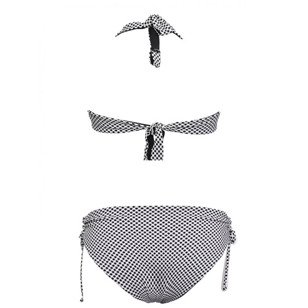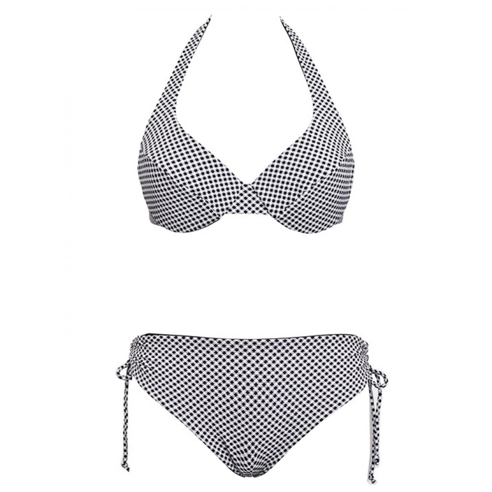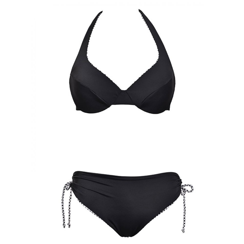 Двусторонний раздельный купальник: бюстгальтер с мягкой чашкой (без вкладышей), на косточках, и трусики-слип, высота бочков регулируетя кулиской на 5-7 см (высокая и средняя посадка). Застежка- завязка на спинке. Возможны разные варианты крепления бретеле