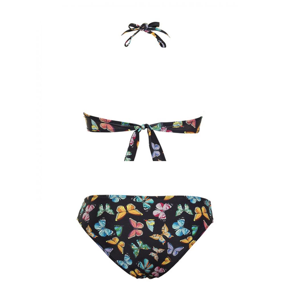 Раздельный купальник: бюстгальтер с формованной чашкой без пуш-ап на косточках. Нерегулируемые бретели с двойным вариантом завязывания. Застежка- завязка на спинке. Трусики-слип, высота бочка 5 см.