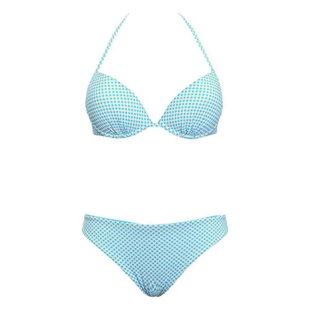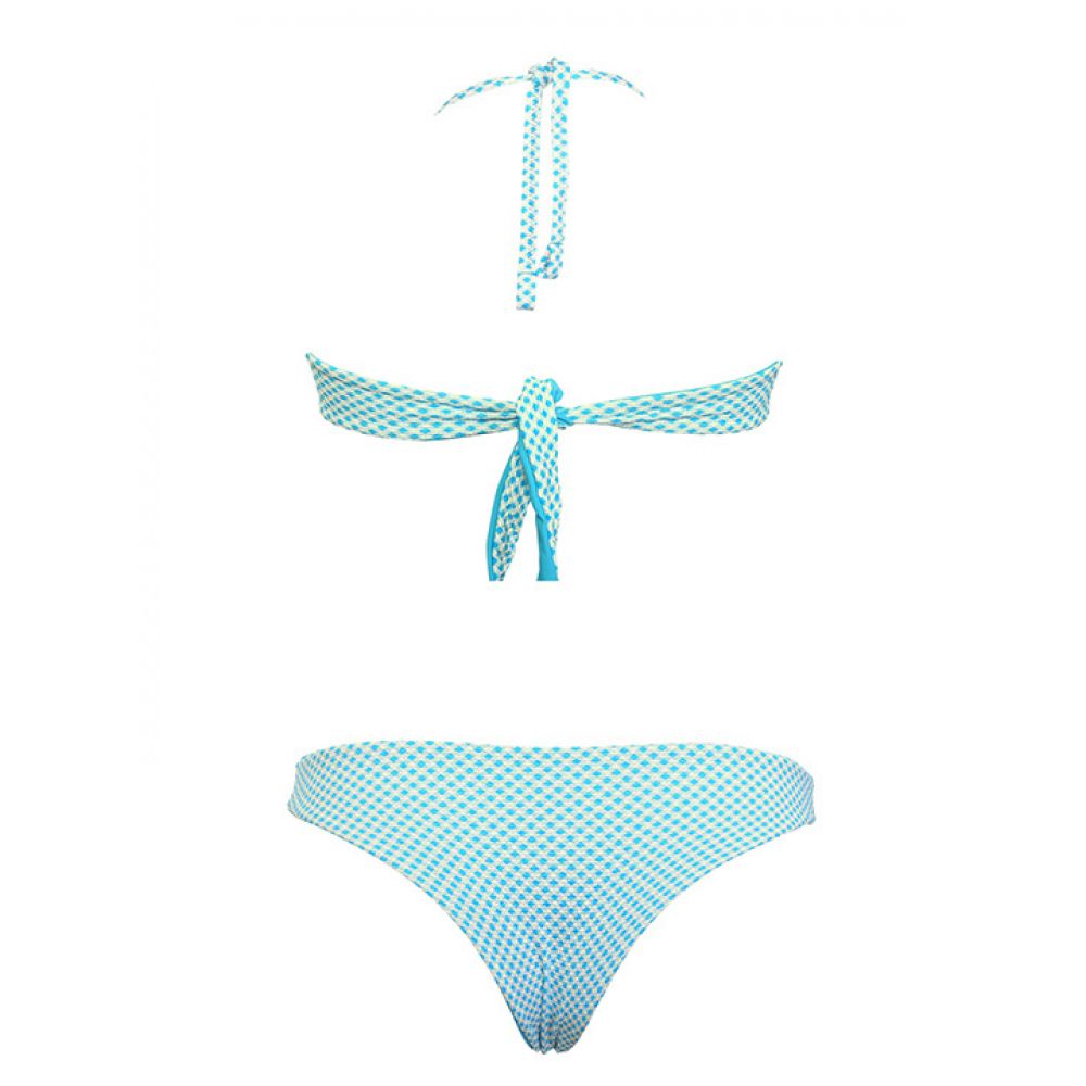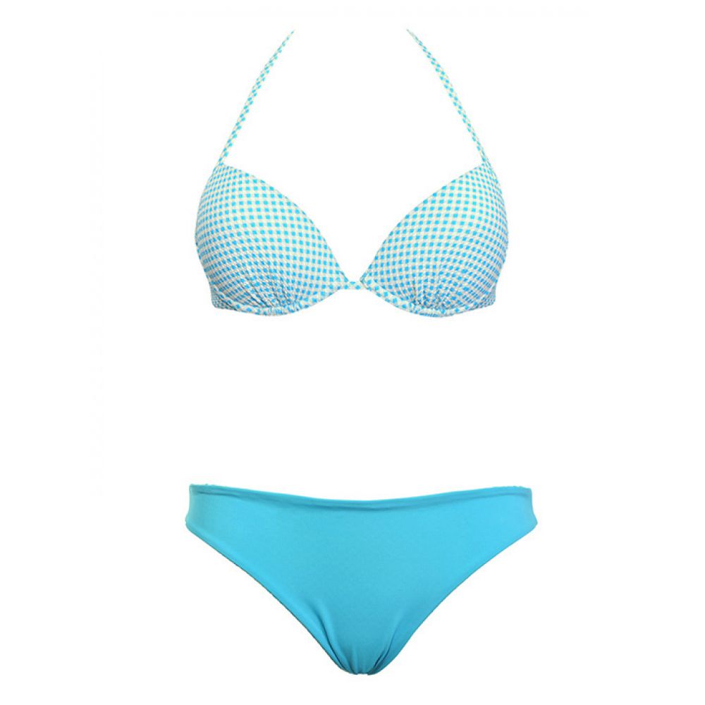 Раздельный купальник: бюстгальтер с формованной чашкой (без пуш-ап) на косточках. Бретели с двойным вариантом завязывания. Застежка- завязка на спинке. Двусторонние трусики-бразильяна, высота бочка 3 см.