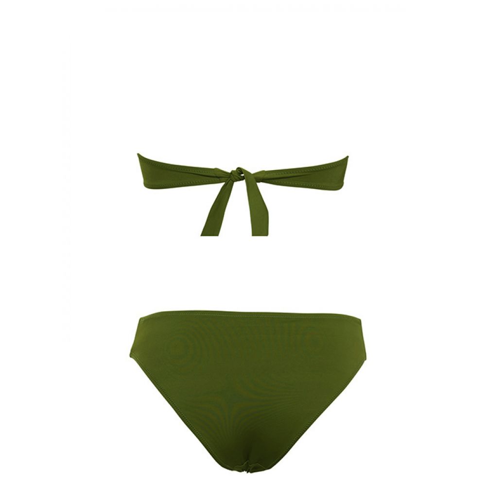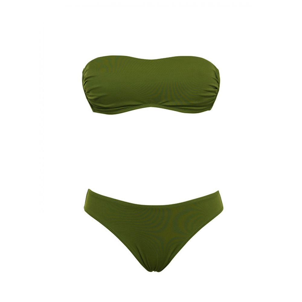 Раздельный купальник: бюстгальтер-бандо с мягкой чашкой без косточек со съемными формованными вкладышами (без пуш-ап) и трусики-слип, высота бочка 5 см. Бочок усилен костью. Отстегивающаяся бретель через шею. Застежка- завязка на спинке. Выполнен из тонко