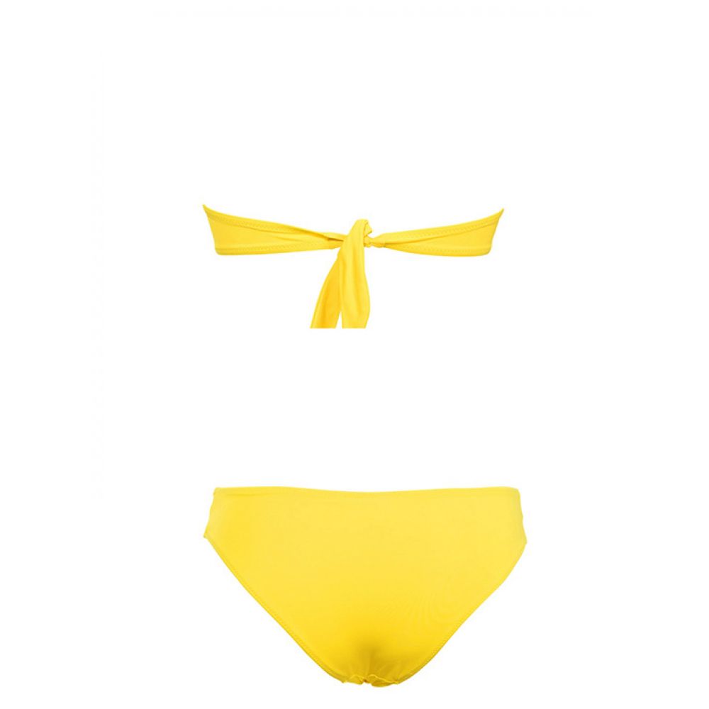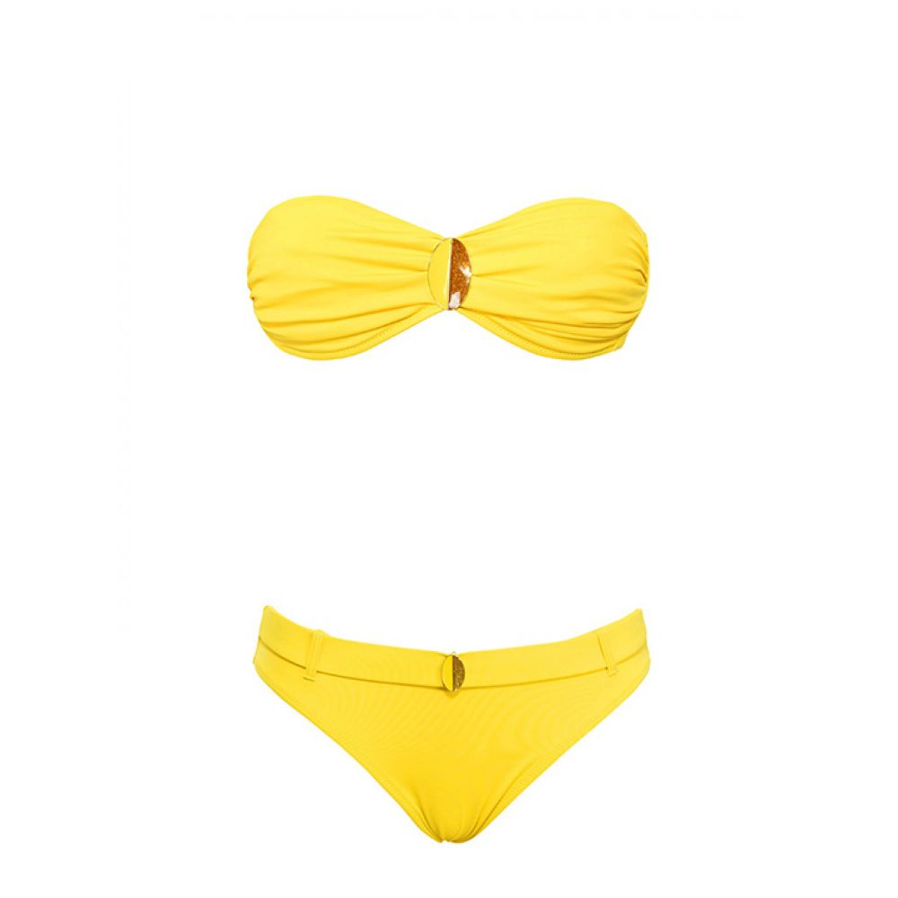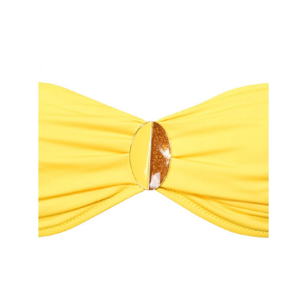 Раздельный купальник: бюстгальтер-бандо с мягкой чашкой без косточек со съемными формованными вкладышами (без пуш-ап), бочок усилен костью. Трусики-слип с декоративным поясом, высота бочка 6 см. Отстегивающаяся бретель через шею. Застежка- завязка на спин