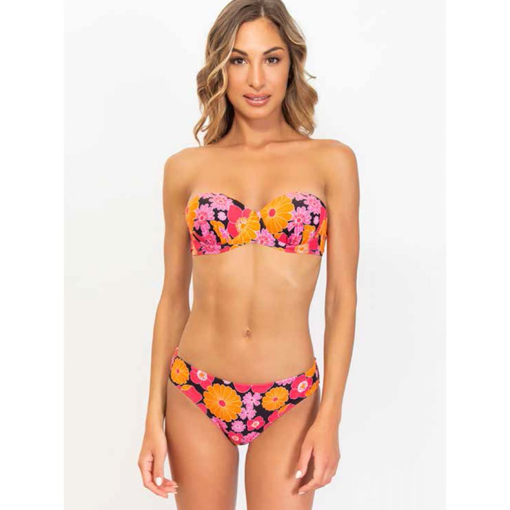 Раздельный купальник: бюстгальтер-фашия с градуированной чашкой (небольшой пуш-ап), на косточках. Отстегивающаяся бретель через шею. Застежка- завязка на спинке. Трусики-слип со средней линией талии, высота бочка 5 см.