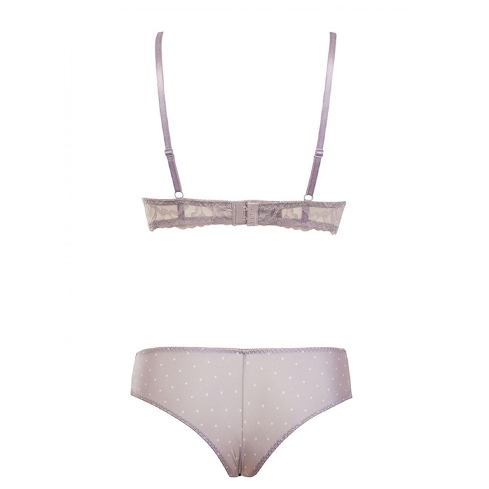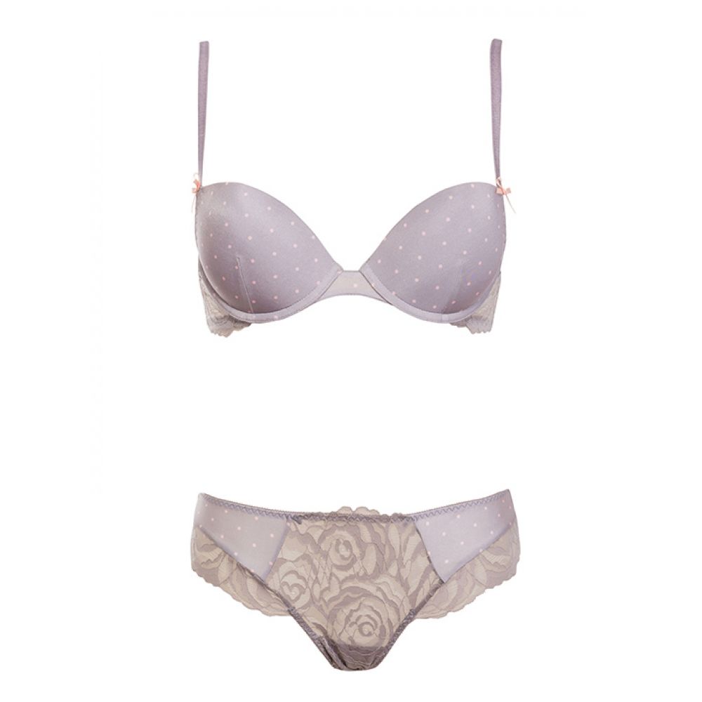 Комплект: бюстгальтер пуш-ап с градуированной чашкой на косточках и трусики-бразильяна. Несъемные бретели. Выполнен из принтованной в горох микрофибры и кружева. Коллекция "Crazy dots".