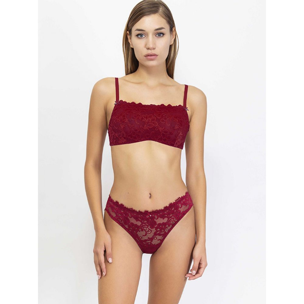 Комплект: бюстгальтер-бандо с мягкой чашкой, на скрытых косточках, и трусики-бразильяна со средней линией талии. Несъемные регулируемые бретели. Застежка в 2 ряда на 4 позиции. Выполнено из кружева. Коллекция "Berries".