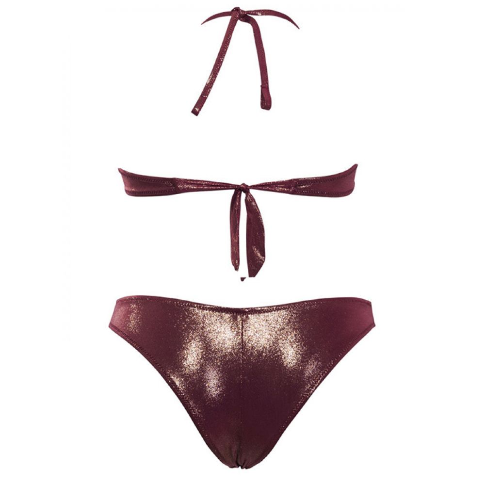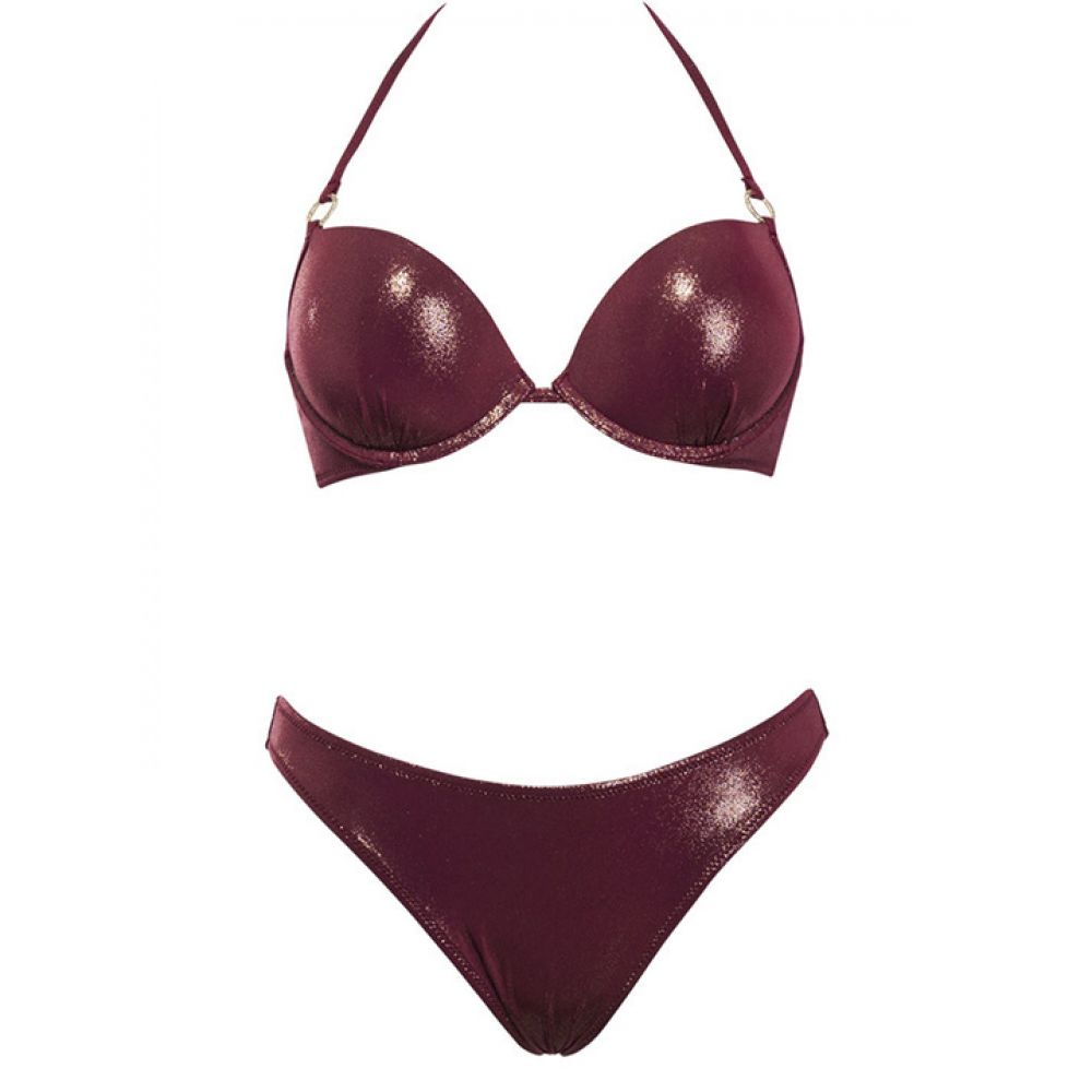 Раздельный купальник: бюстгальтер пуш-ап с градуированной чашкой на косточках и трусики-бразильяна. Застежка - завязка на спинке. Бретели с двойным вариантом завязывания. Выполнен из тонкой микрофибры с золотистым напылением.