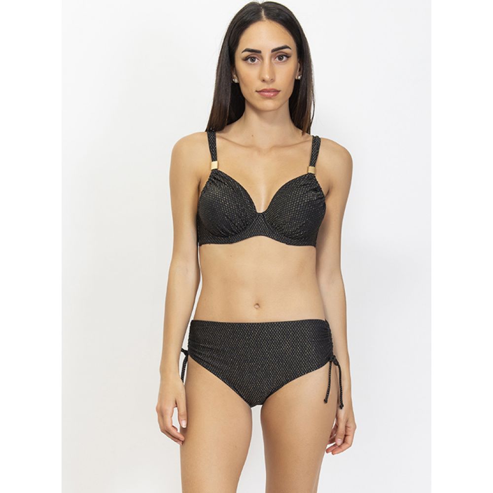 Раздельный купальник: бюстгальтер на косточках с мягкой чашкой, по пройме регулируемая сборка. Бочок усилен костью. Отстегивающиеся бретели с двойным вариантом завязывания. Застежка- поворотный замок. Трусики-слип, высота бочков регулируется кулиской на 5
