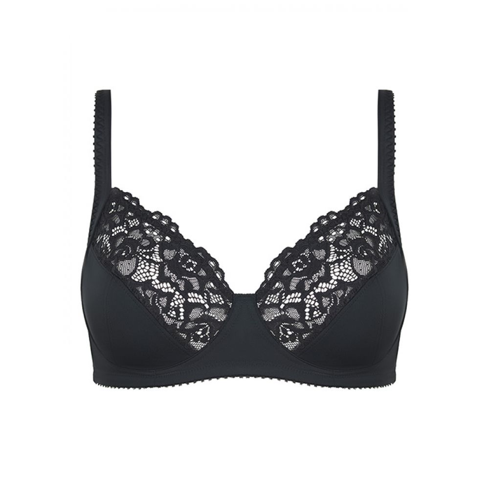 Элегантный бюстгальтер с мягкой чашечкой без косточки, выполнен из гладкого эластичного полотна, верхняя часть чашечки из кружева. Застежка - 2 крючка на 3 позиции. Регулируемые широкие бретели.